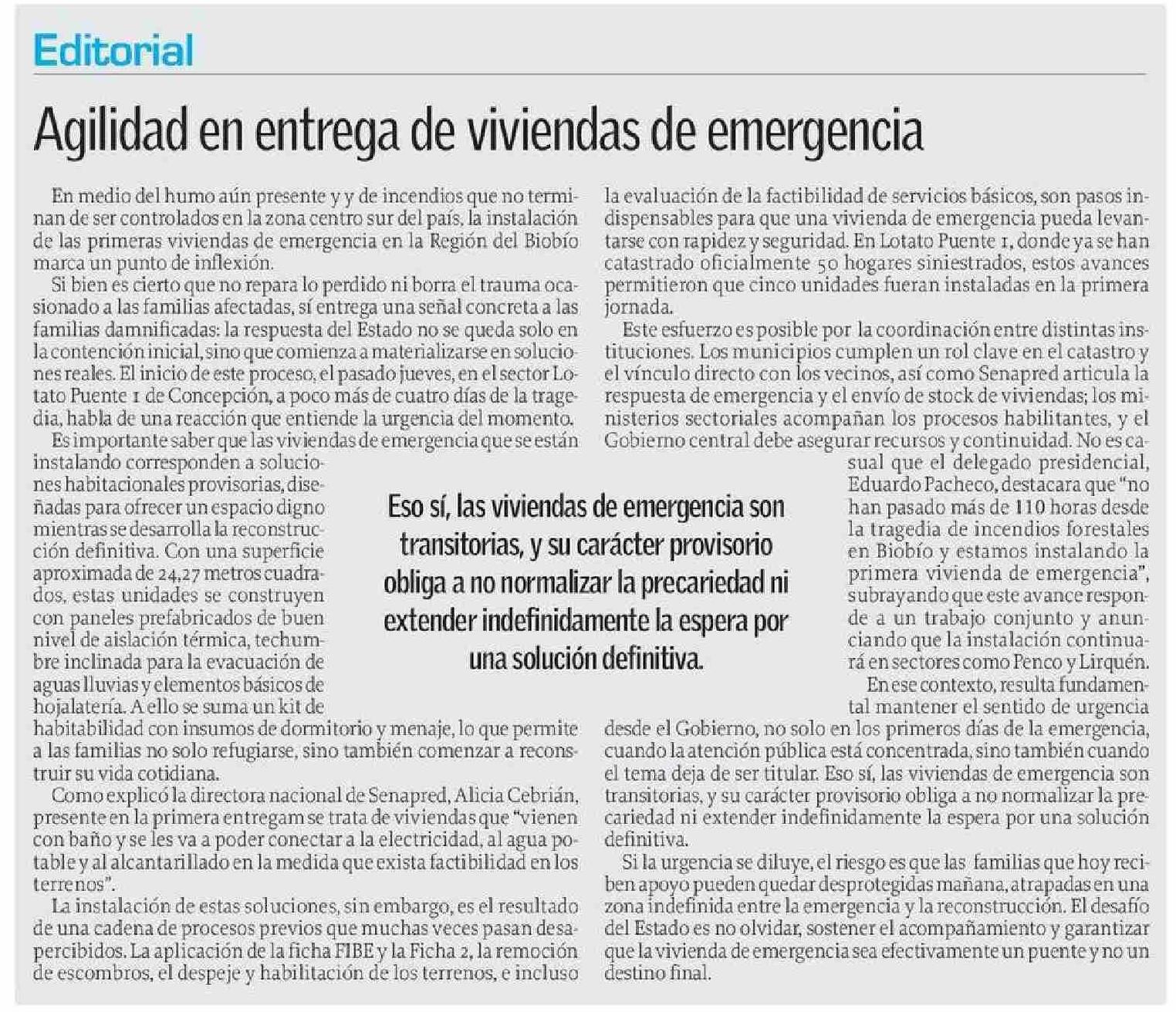 Editorial: Agilidad en entrega de viviendas de emergencia 24-01-2026 El Sur |