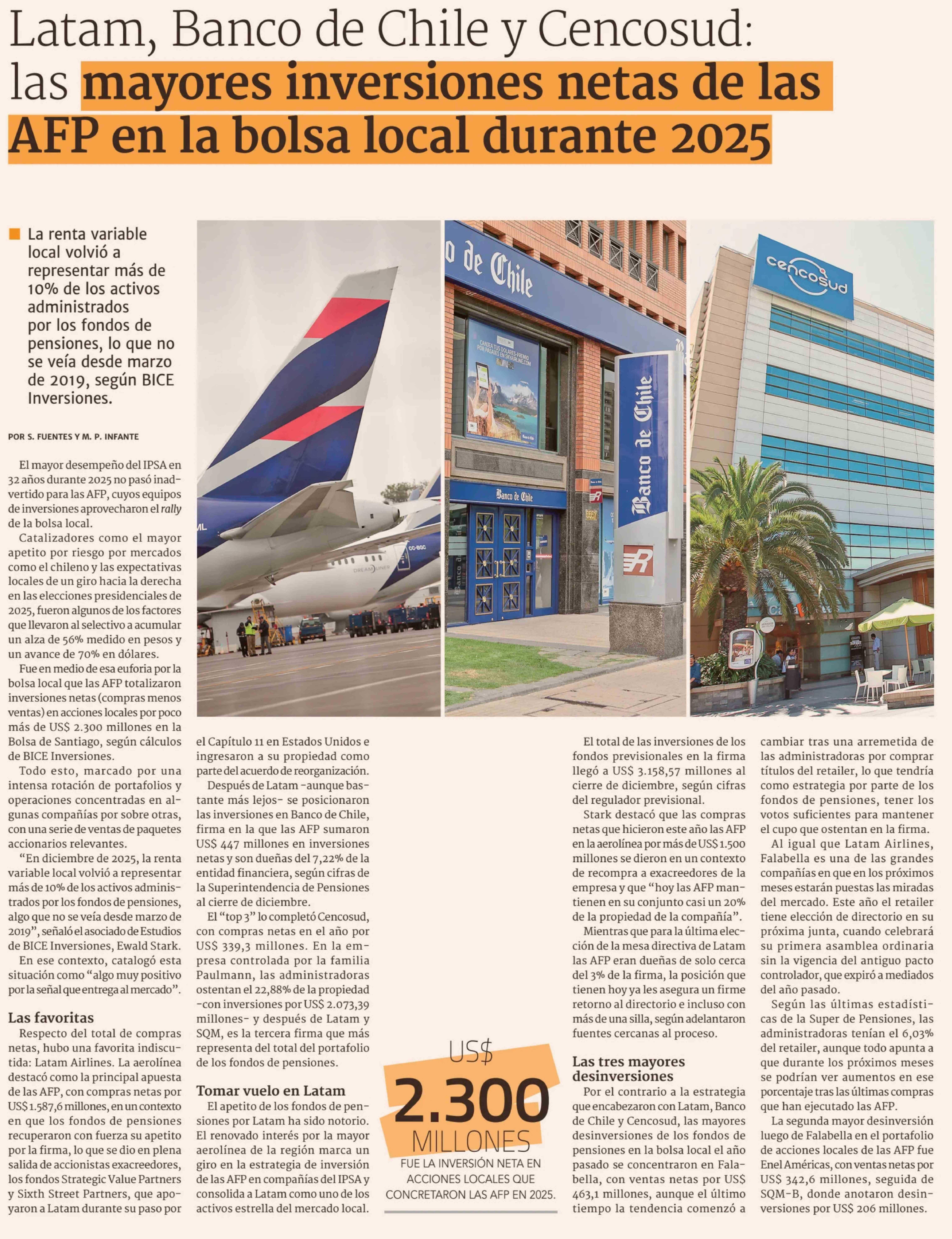 Título: Latam, Banco de Chile y Cencosud: las mayores inversiones netas de las AFP en la bolsa local durante 2025