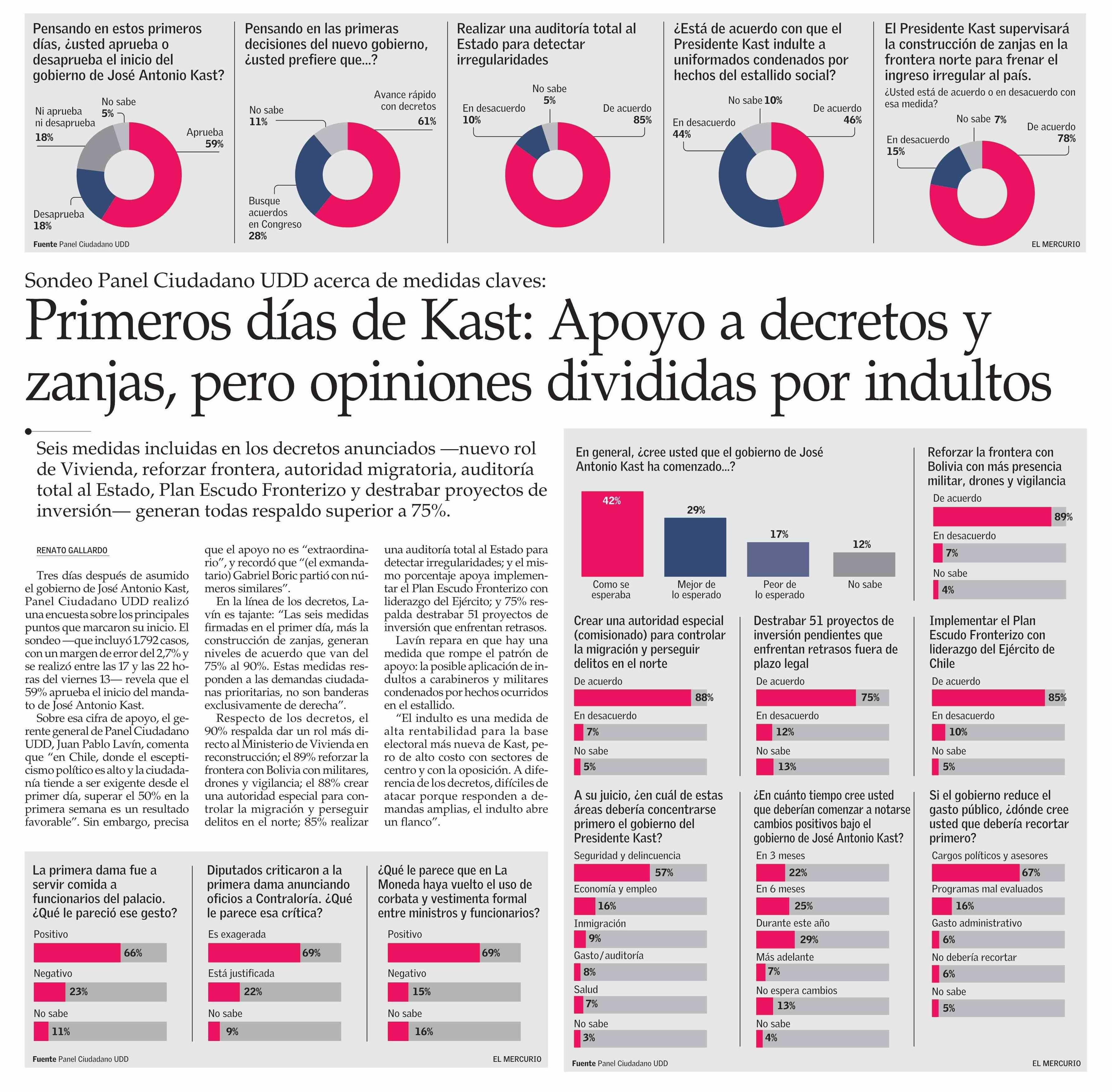 Primeros días de Kast: Apoyo a decretos y zanjas, pero opiniones divididas por indultos 15-03-2026 El Mercurio |