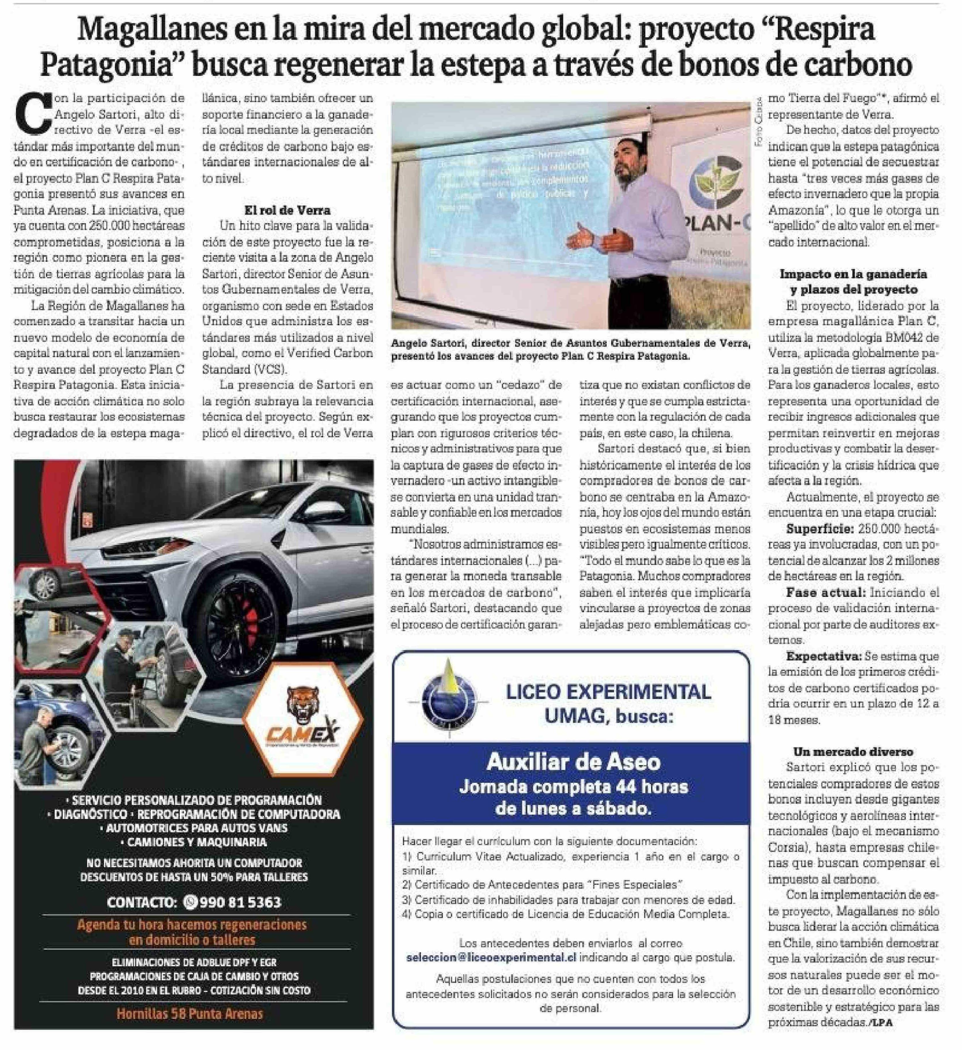 Magallanes en la mira del mercado global: proyecto "Respira Patagonia" busca regenerar la estepa a través de bonos de carbono 18-03-2026 La Prensa Austral |