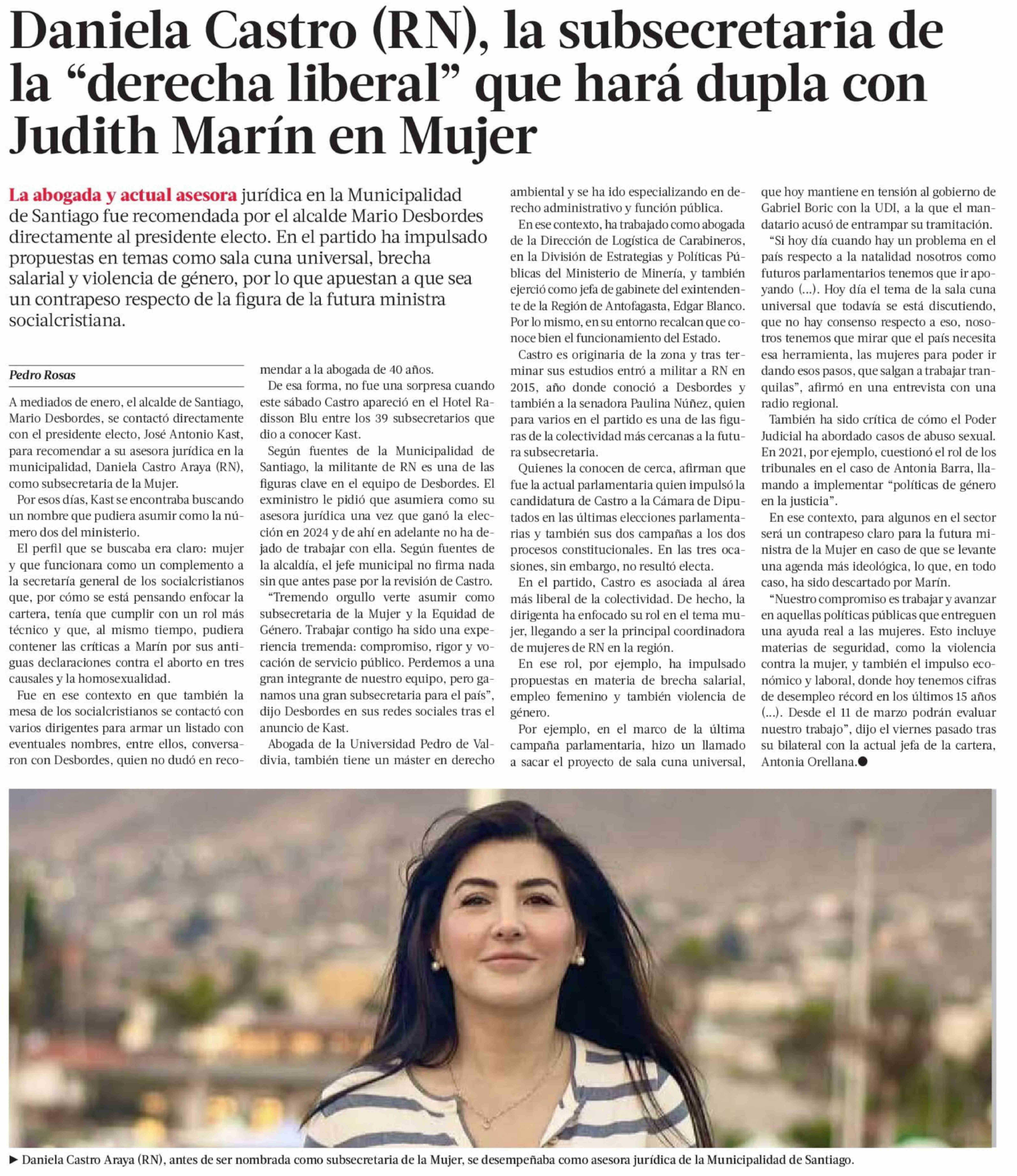 Daniela Castro (RN), la subsecretaria de la "derecha liberal" que hará dupla con Judith Marín en Mujer 11-02-2026 La Tercera |