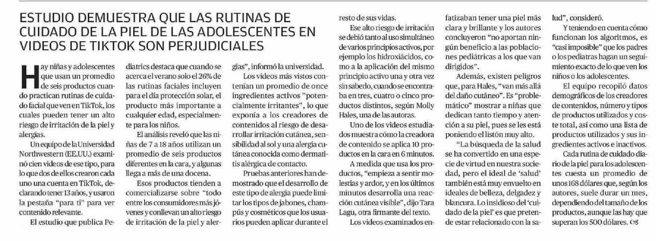 ESTUDIO DEMUESTRA QUE LAS RUTINAS DE CUIDADO DE LA PIEL DE LAS ADOLESCENTES EN VIDEOS DE TIKTOK SON PERJUDICIALES 10-06-2025 El Diario de Atacama |