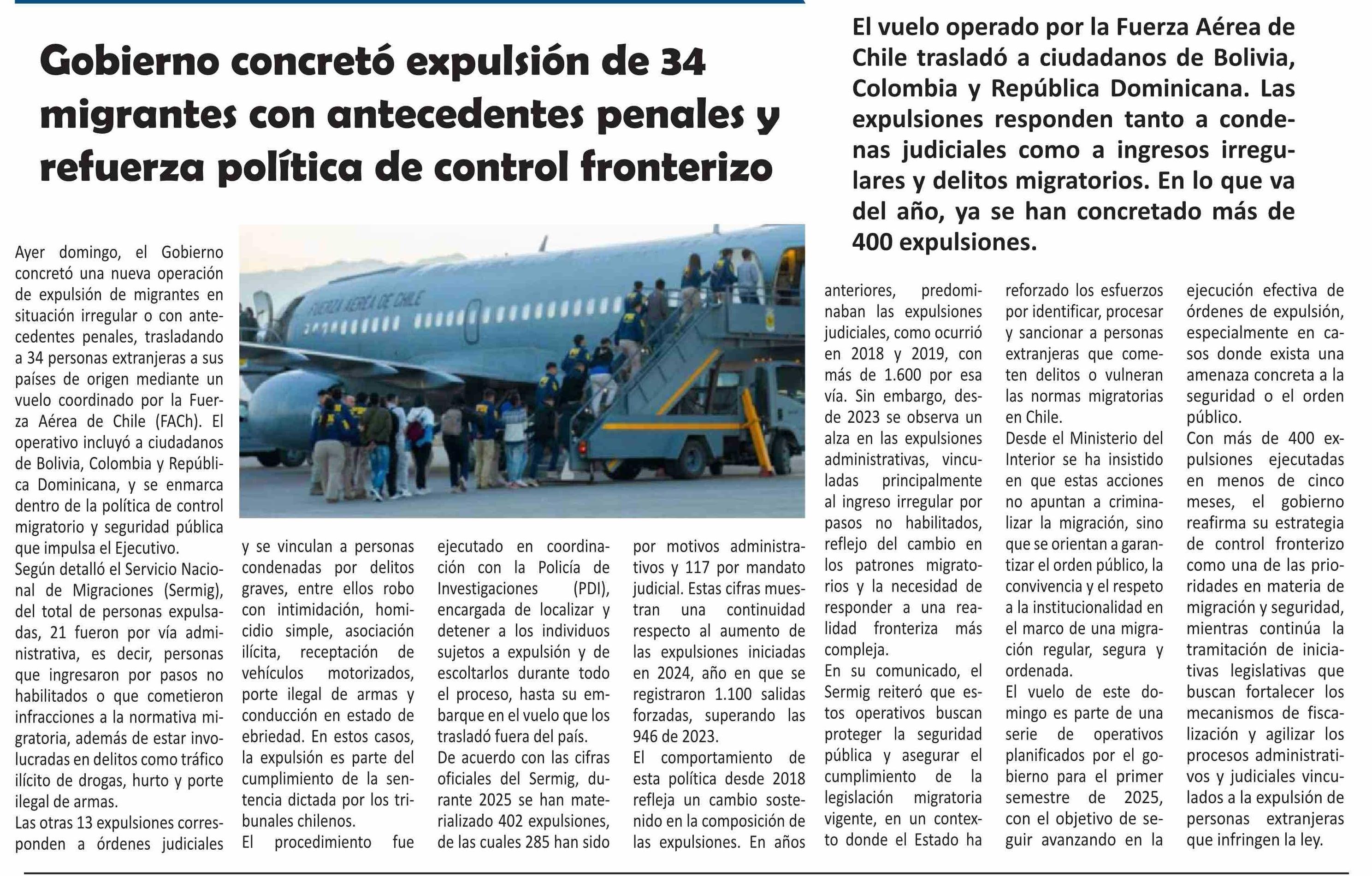 Título: Gobierno concretó expulsión de 34 migrantes con antecedentes penales y refuerza política de control fronterizo