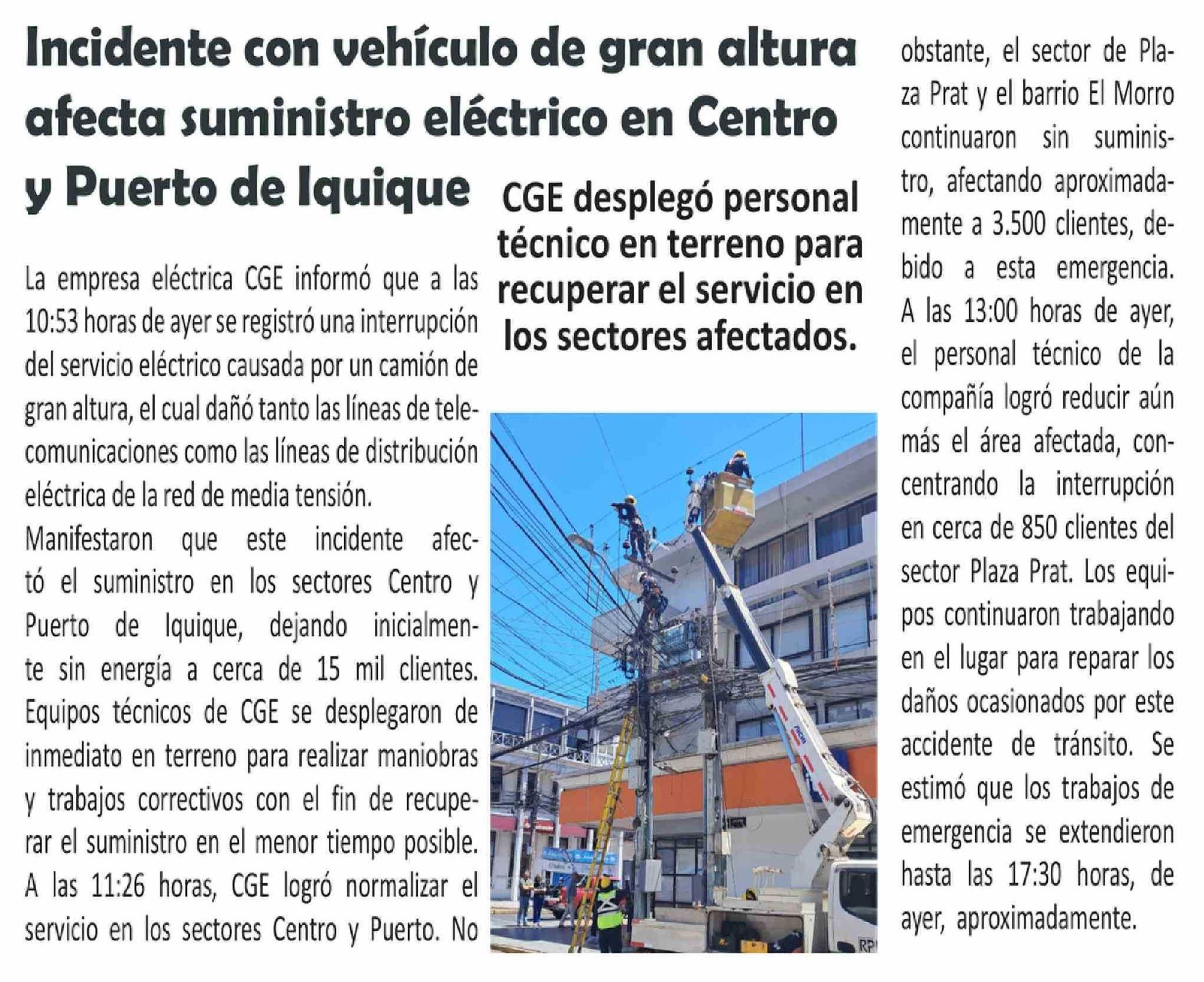 Título: Incidente con vehículo de gran altura afecta suministro eléctrico en Centro y Puerto de Iquique CGE desplegó personal
