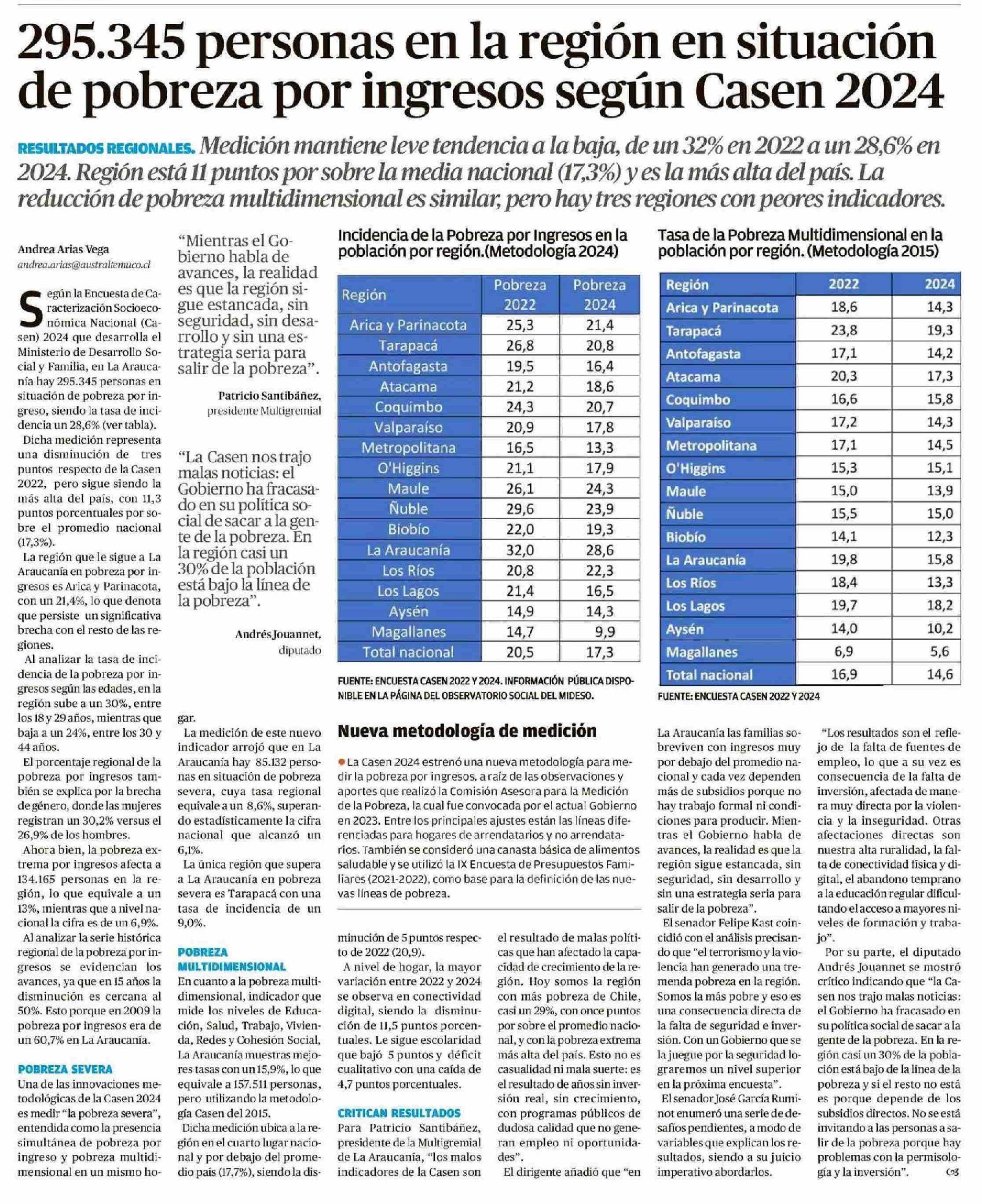 295.345 Personas en la región en situación de pobreza por ingresos según Casen 2024 10-01-2026 El Austral de la Araucanía |
