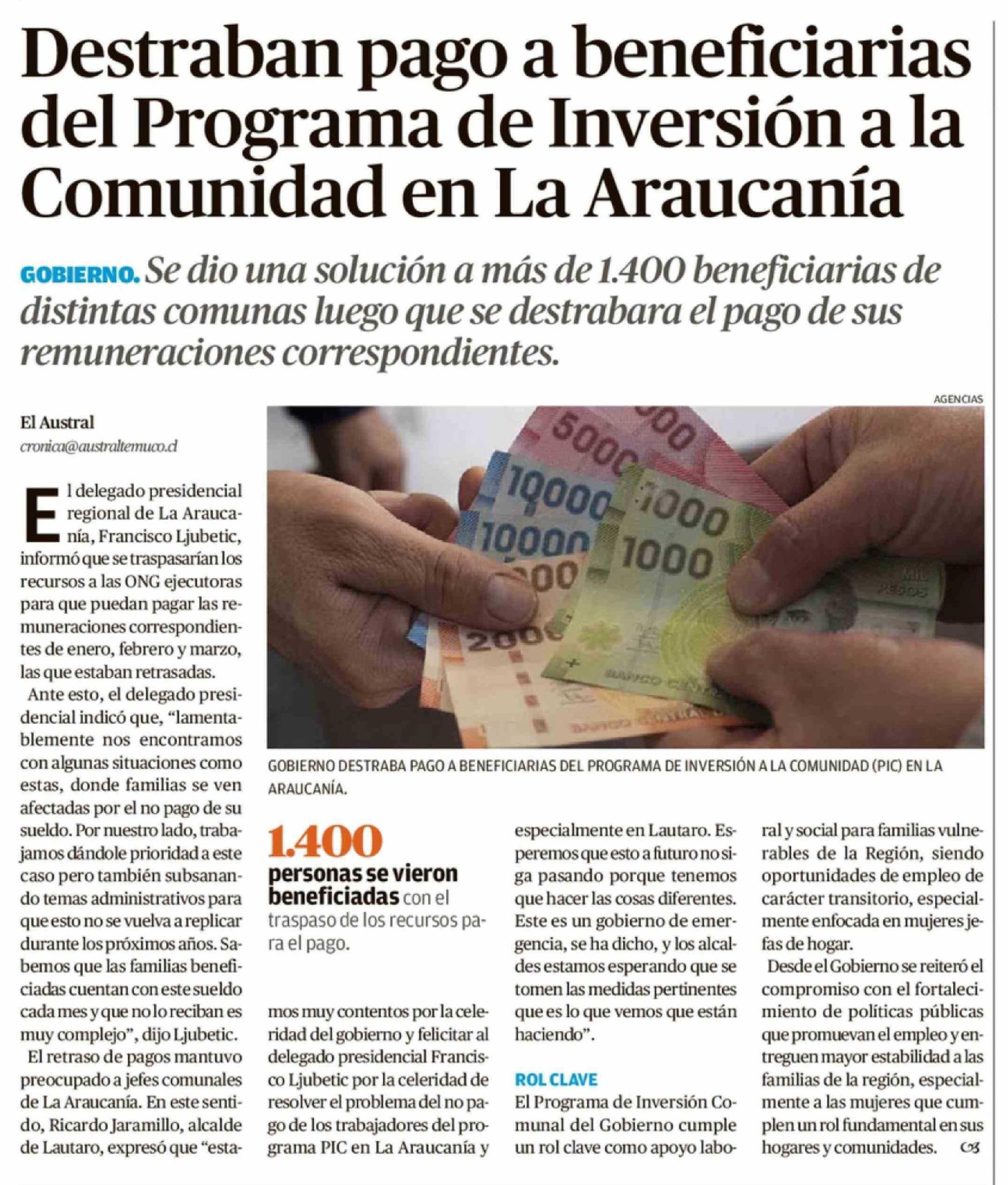 Título: Destraban pago a beneficiarias del Programa de Inversión a la Comunidad en La Araucanía