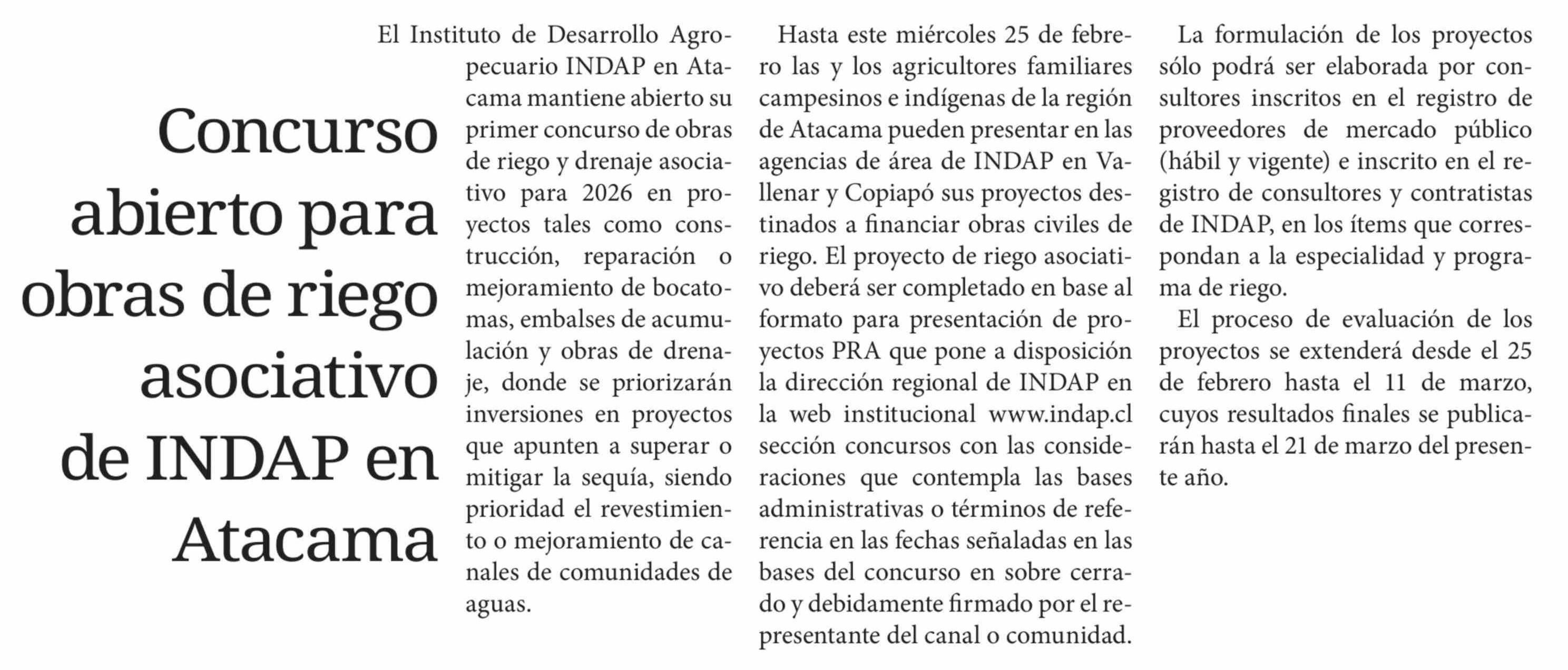 Concurso abierto para obras de riego asociativo de INDAP en Atacama 21-02-2026 Diario Chañarcillo |