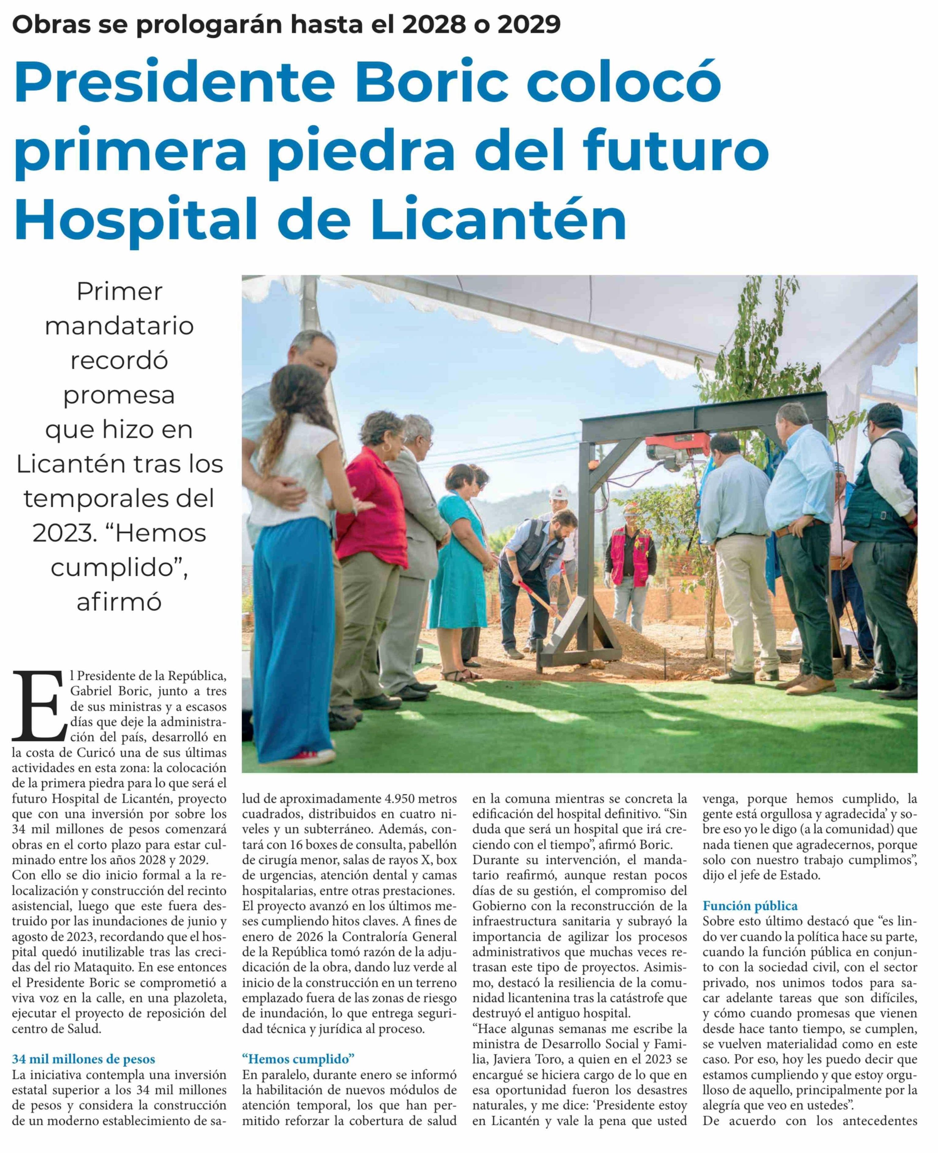 Presidente Boric colocó primera piedra del futuro Hospital de Licantén 01-03-2026 Diario Talca |