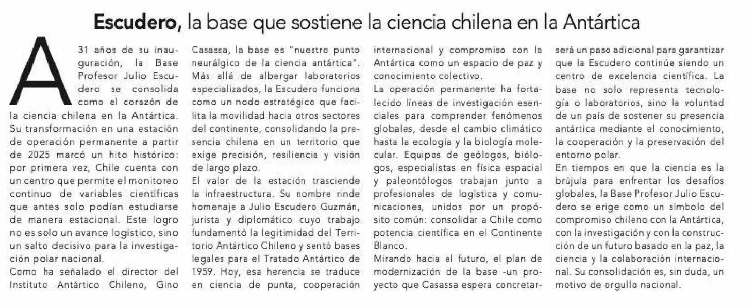 Escudero, la base que sostiene la ciencia chilena en la Antártica 06-02-2026 La Prensa Austral |