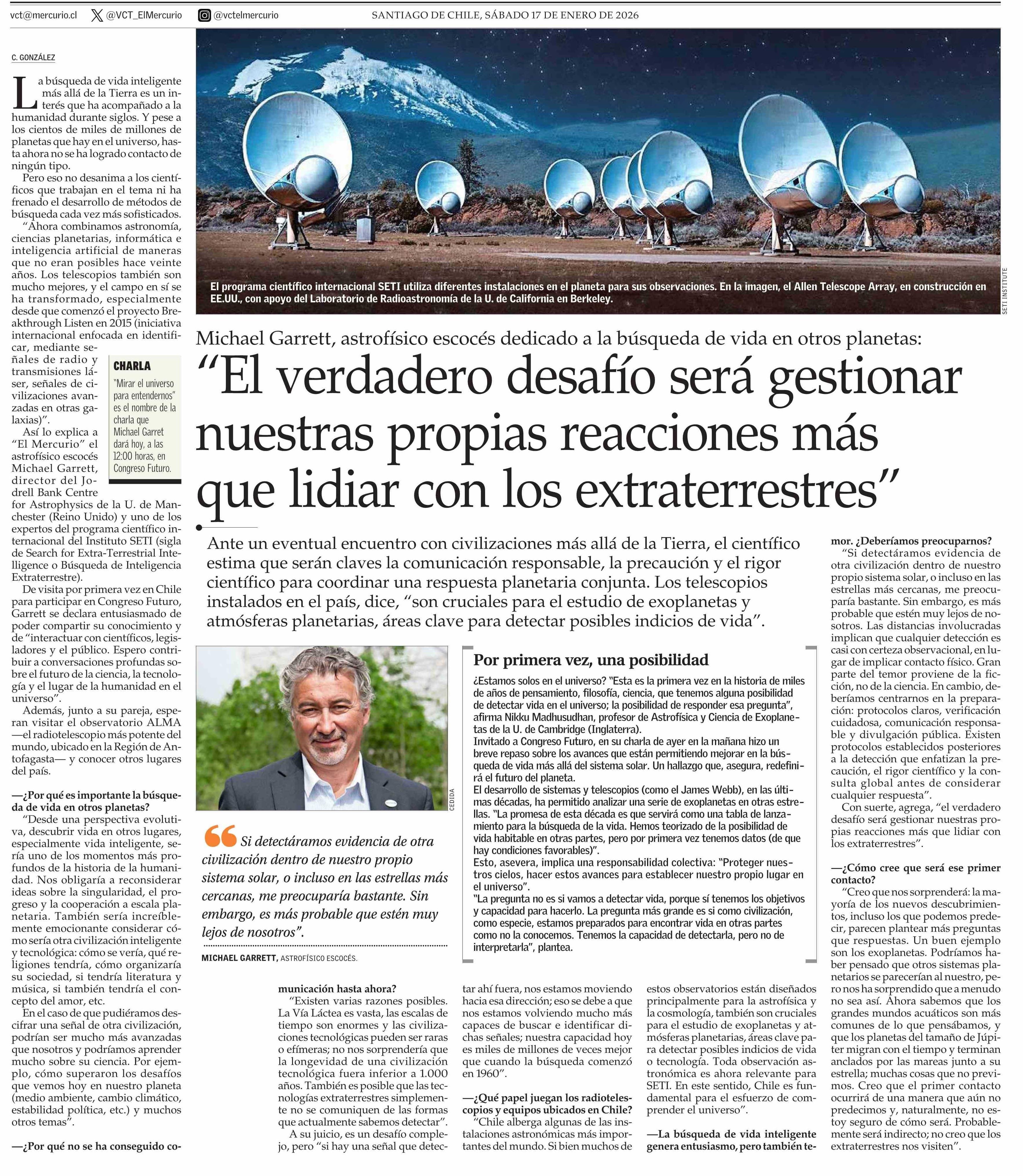 “El verdadero desafío será gestionar nuestras propias reacciones más que lidiar con los extraterrestres” 17-01-2026 El Mercurio |