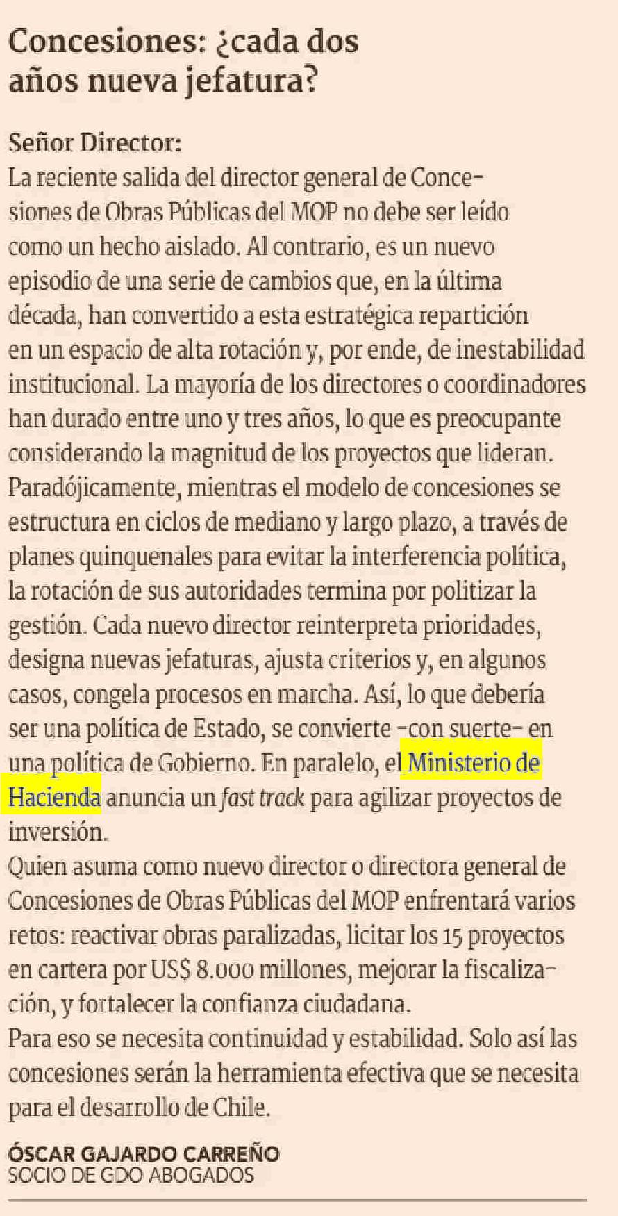 CARTAS: Concesiones: ¿cada dos años nueva jefatura? 29-05-2025 Diario Financiero |