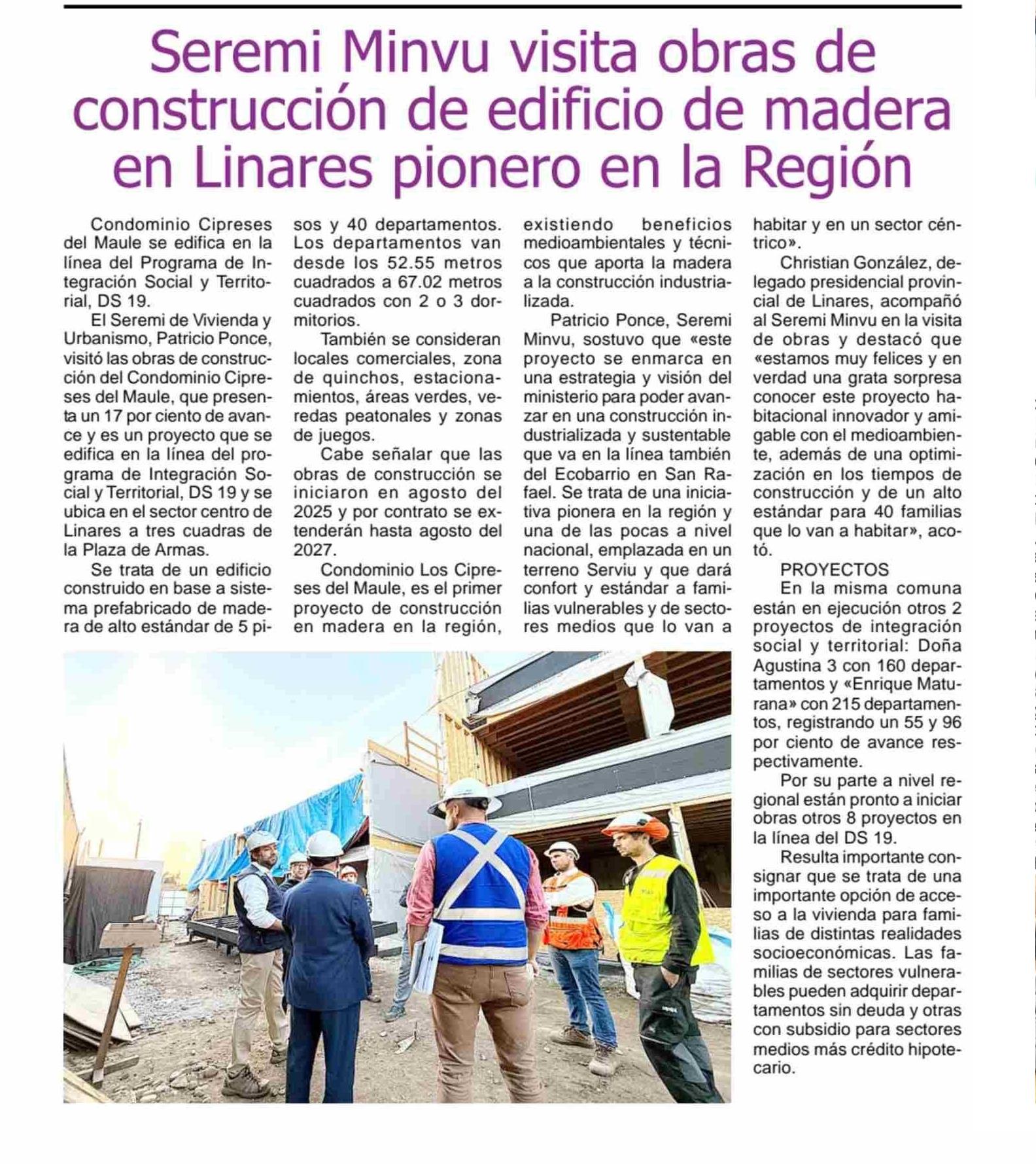 Título: Seremi Minvu visita obras de construcción de edificio de madera en Linares pionero en la Región