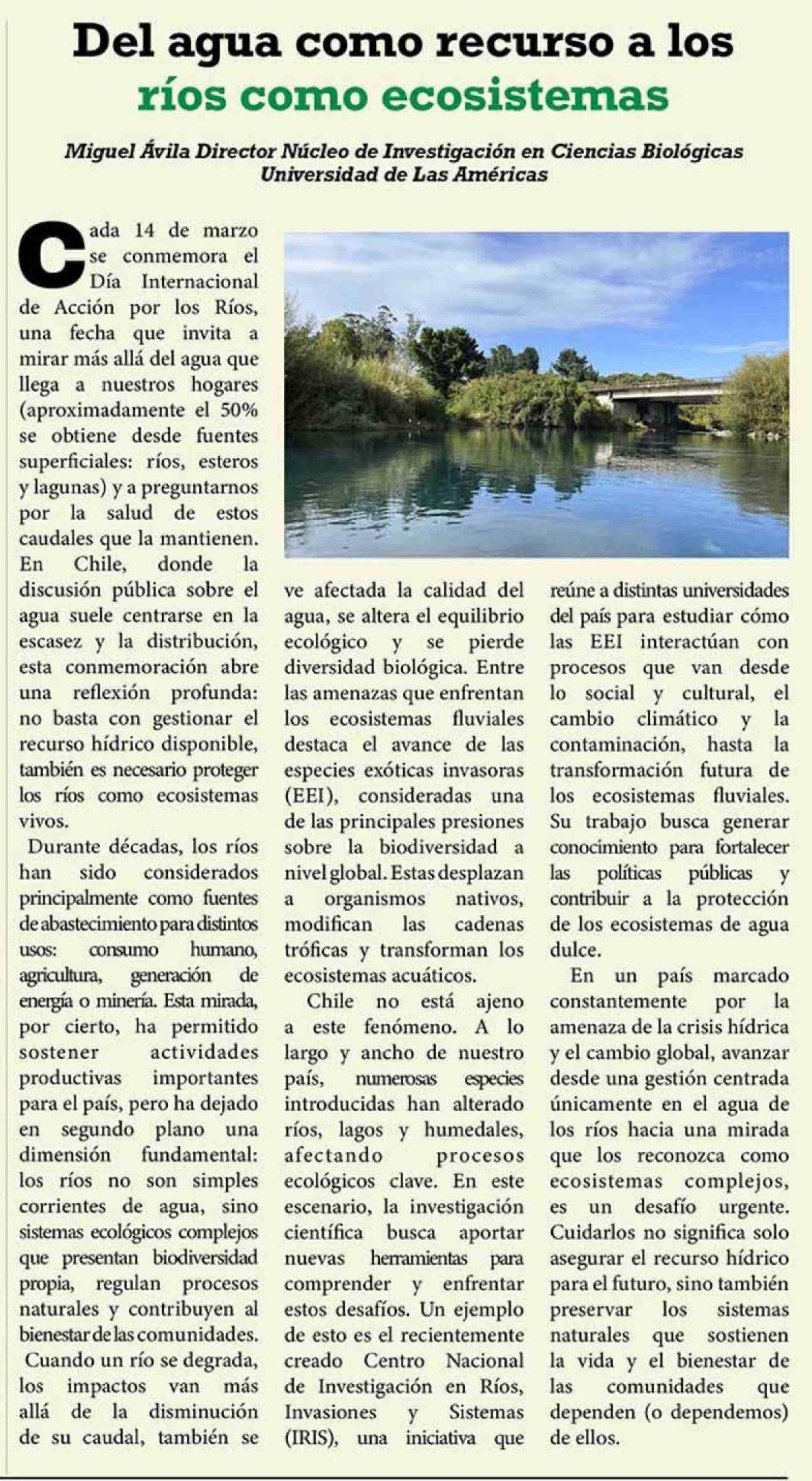 Columnas de Opinión: Del agua como recurso a los ríos como ecosistemas 14-03-2026 El Heraldo Austral |