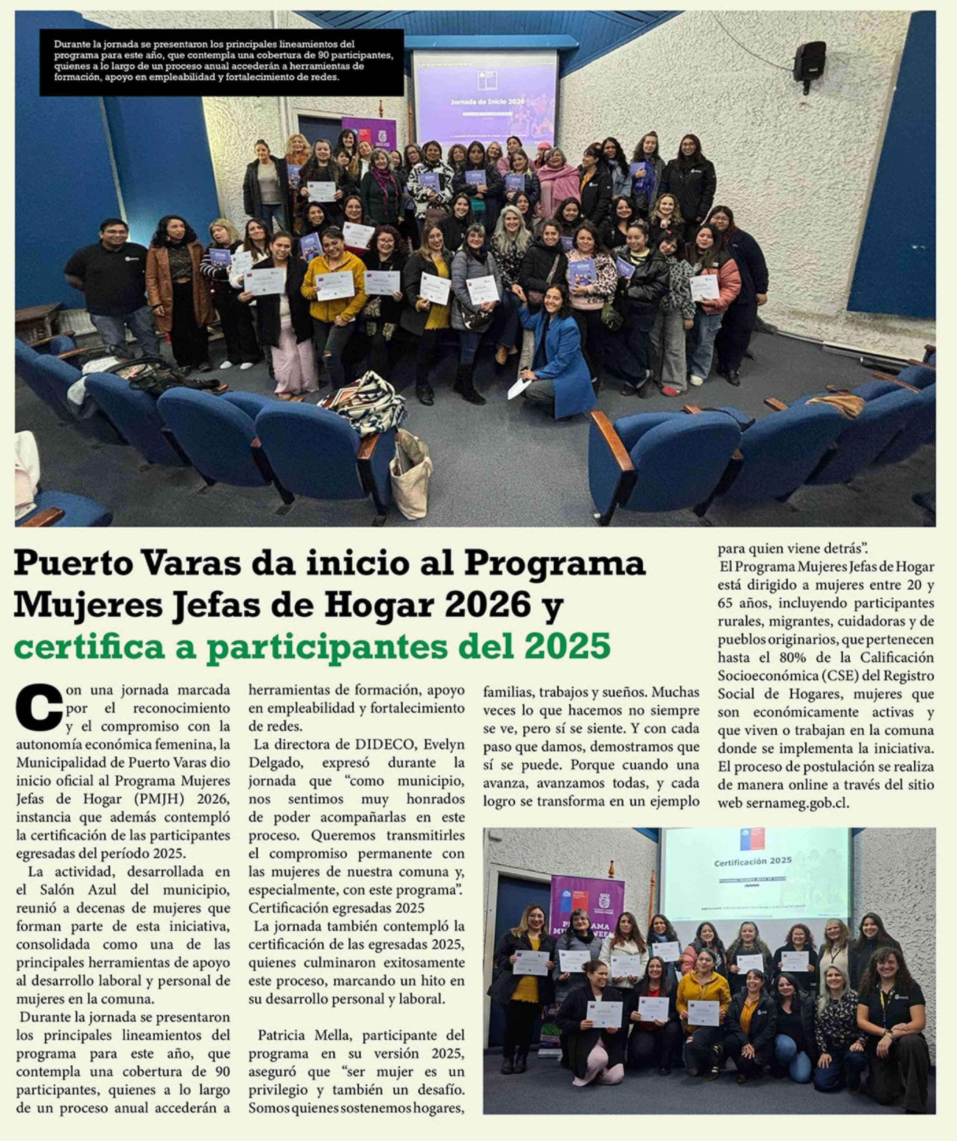Puerto Varas da inicio al Programa Mujeres Jefas de Hogar 2026 y certifica a participantes del 2025 27-03-2026 El Heraldo Austral |
