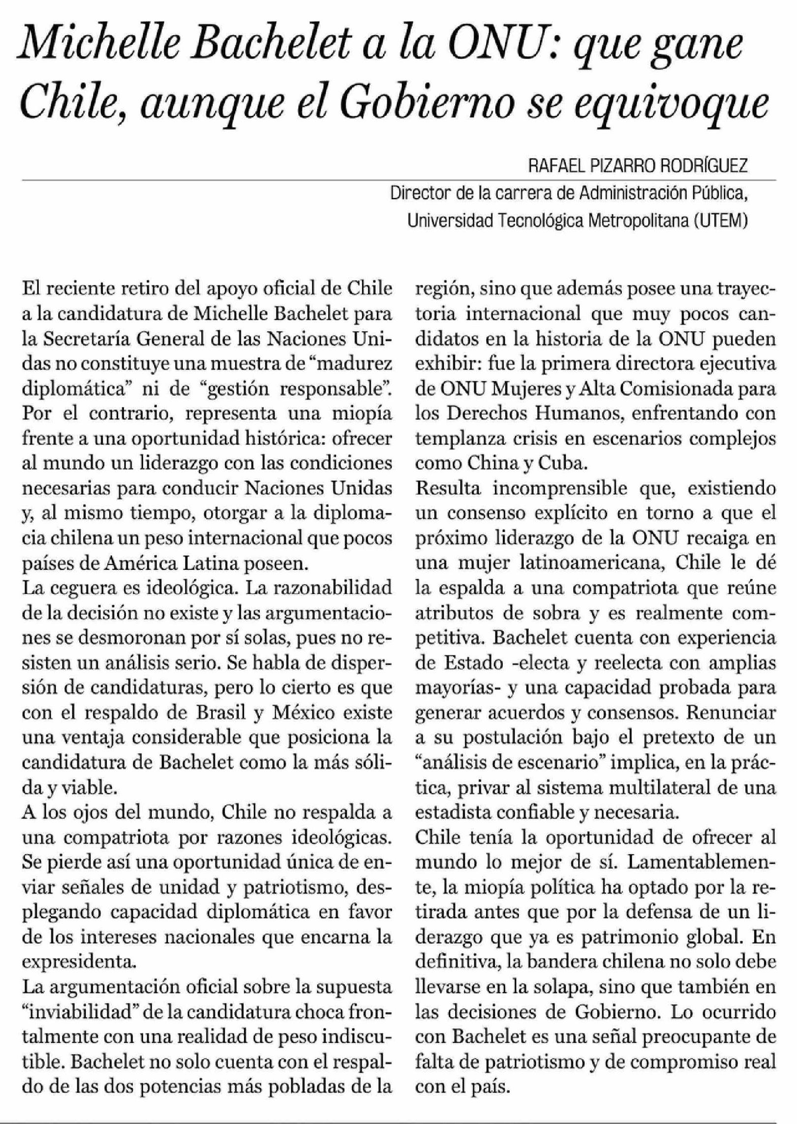 | Título: | Columnas de Opinión: Michelle Bachelet a la ONU: que gane Chile, aunque el Gobierno se equivoque |