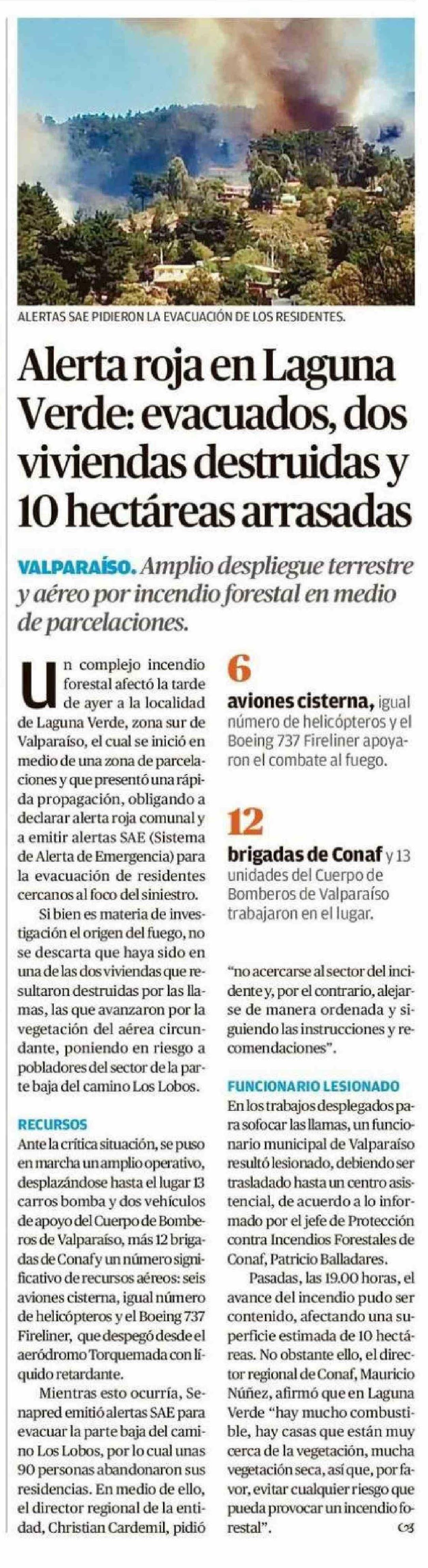 Alerta roja en Laguna Verde: evacuados, dos viviendas destruidas y 10 hectáreas arrasadas 07-01-2026 El Mercurio de Valparaíso |