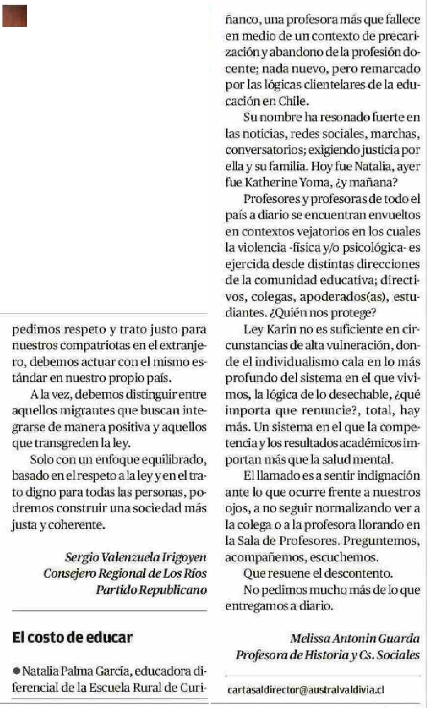 CARTAS: El costo de educar 12-06-2025 Diario Austral Región de Los Ríos |