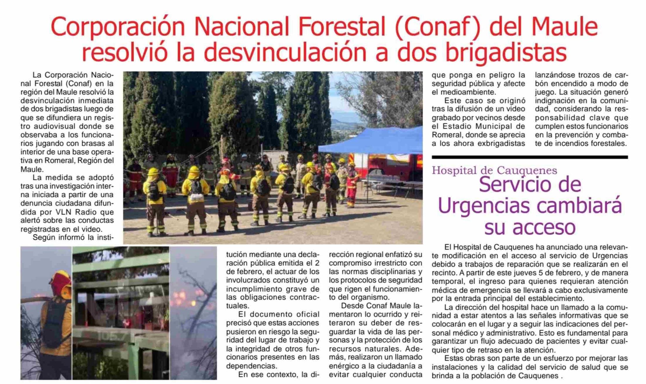 Corporación Nacional Forestal (Conaf) del Maule resolvió la desvinculación a dos brigadistas 05-02-2026 Maule Hoy |