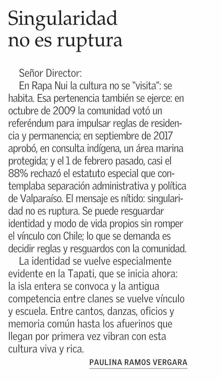 CARTAS: Singularidad no es ruptura 04-02-2026 El Mercurio |