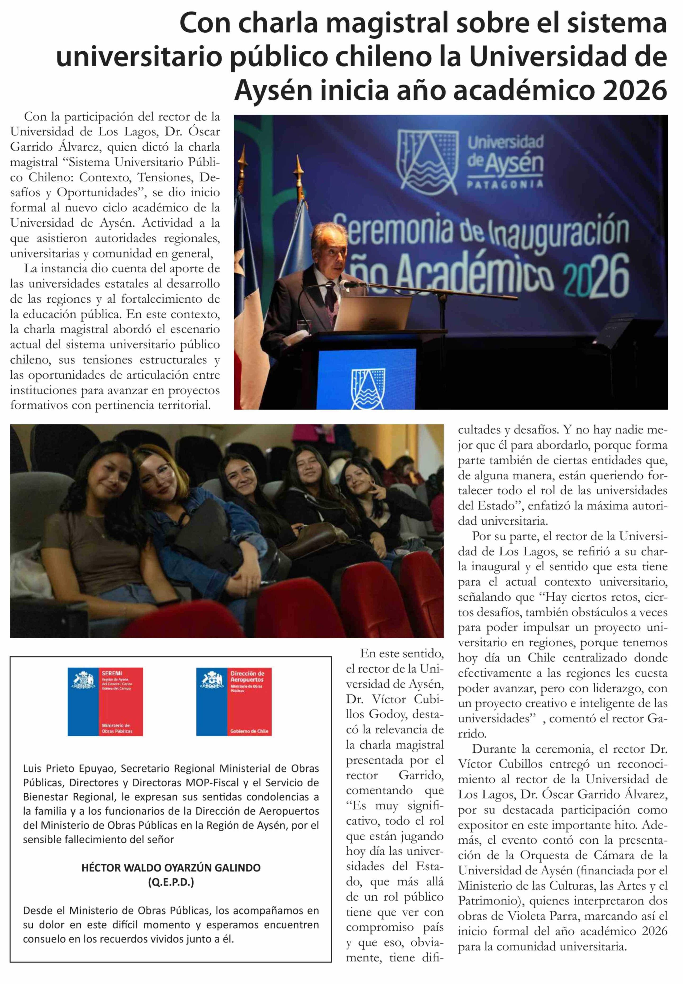 | Título: | Con charla magistral sobre el sistema universitario público chileno la Universidad de Aysén inicia año académico 2026 |