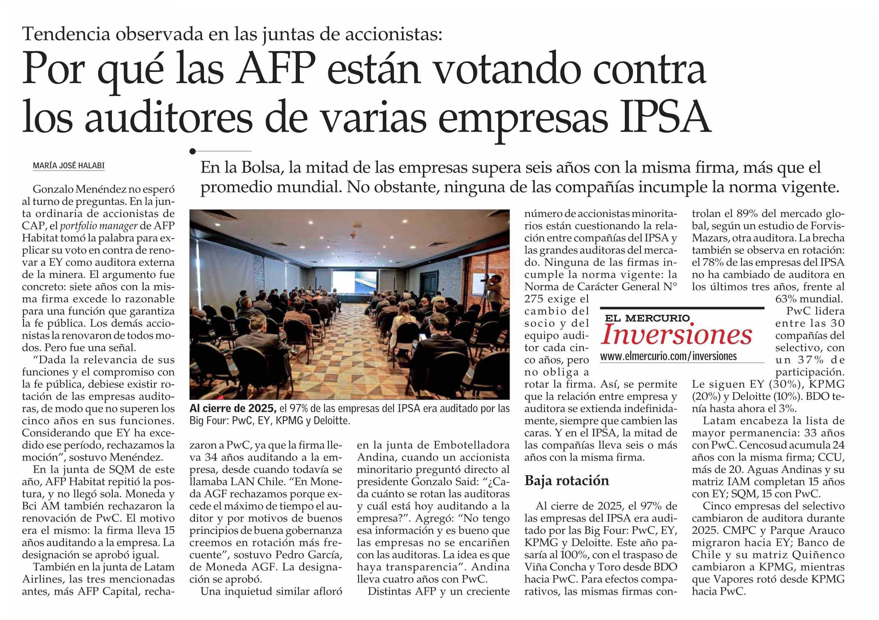 Por qué las AFP están votando contra los auditores de varias empresas IPSA 24-04-2026 El Mercurio |