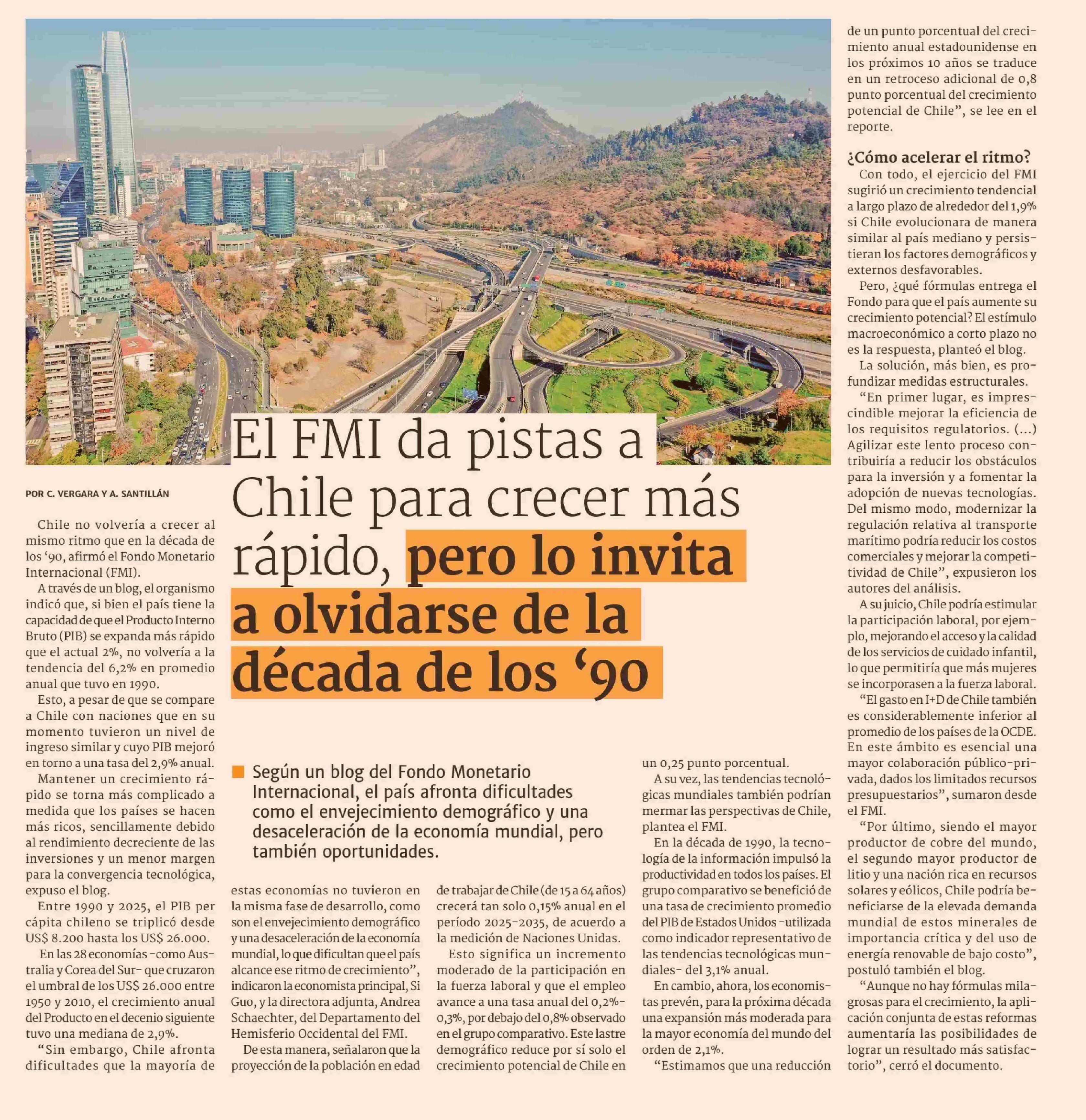 El FMI da pistas a Chile para crecer más rápido, pero lo invita a olvidarse de la decada de los 90 25-06-2025 Diario Financiero |