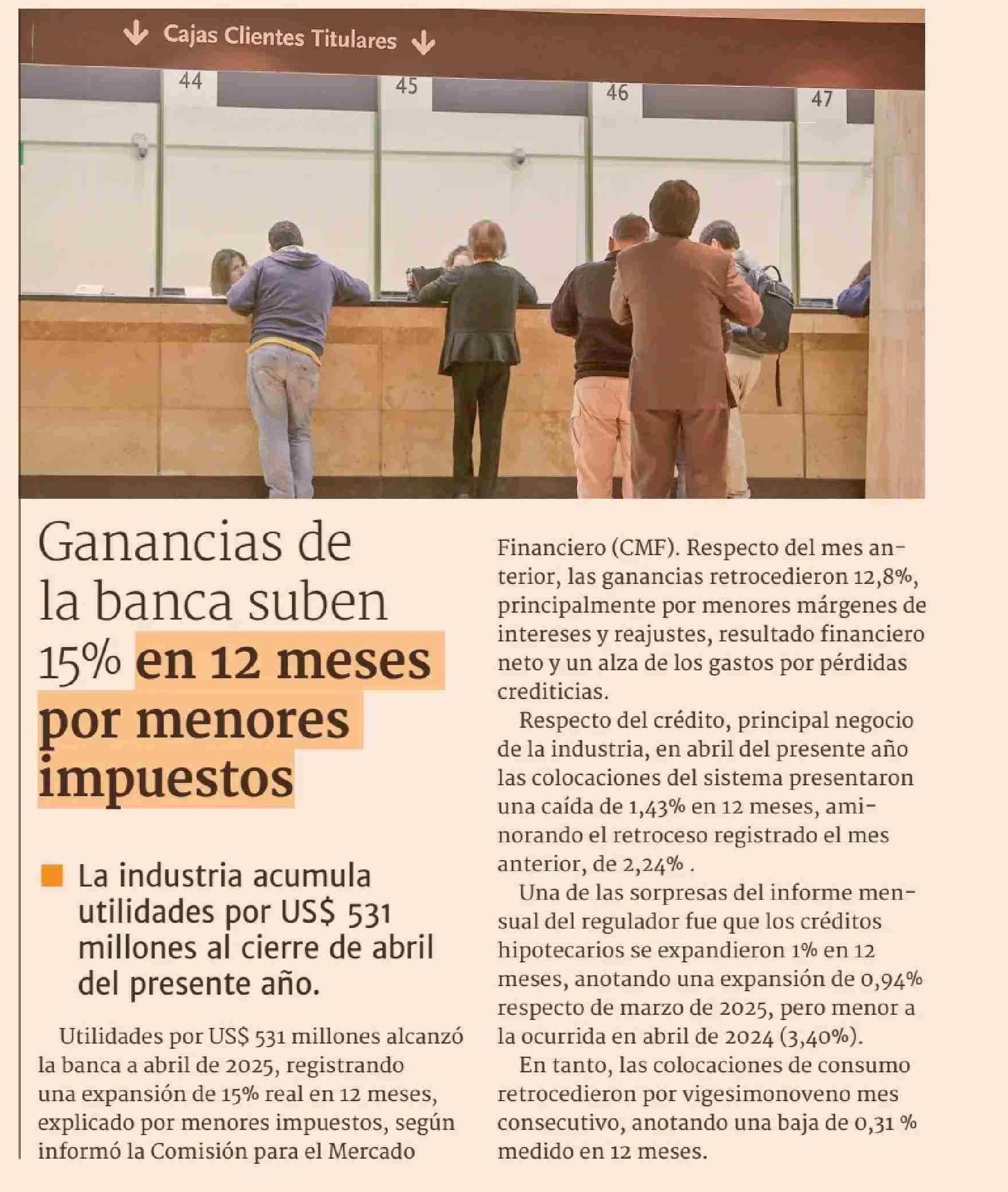 Ganancias de la banca suben 15% en 12 meses por menores impuestos 30-05-2025 Diario Financiero |