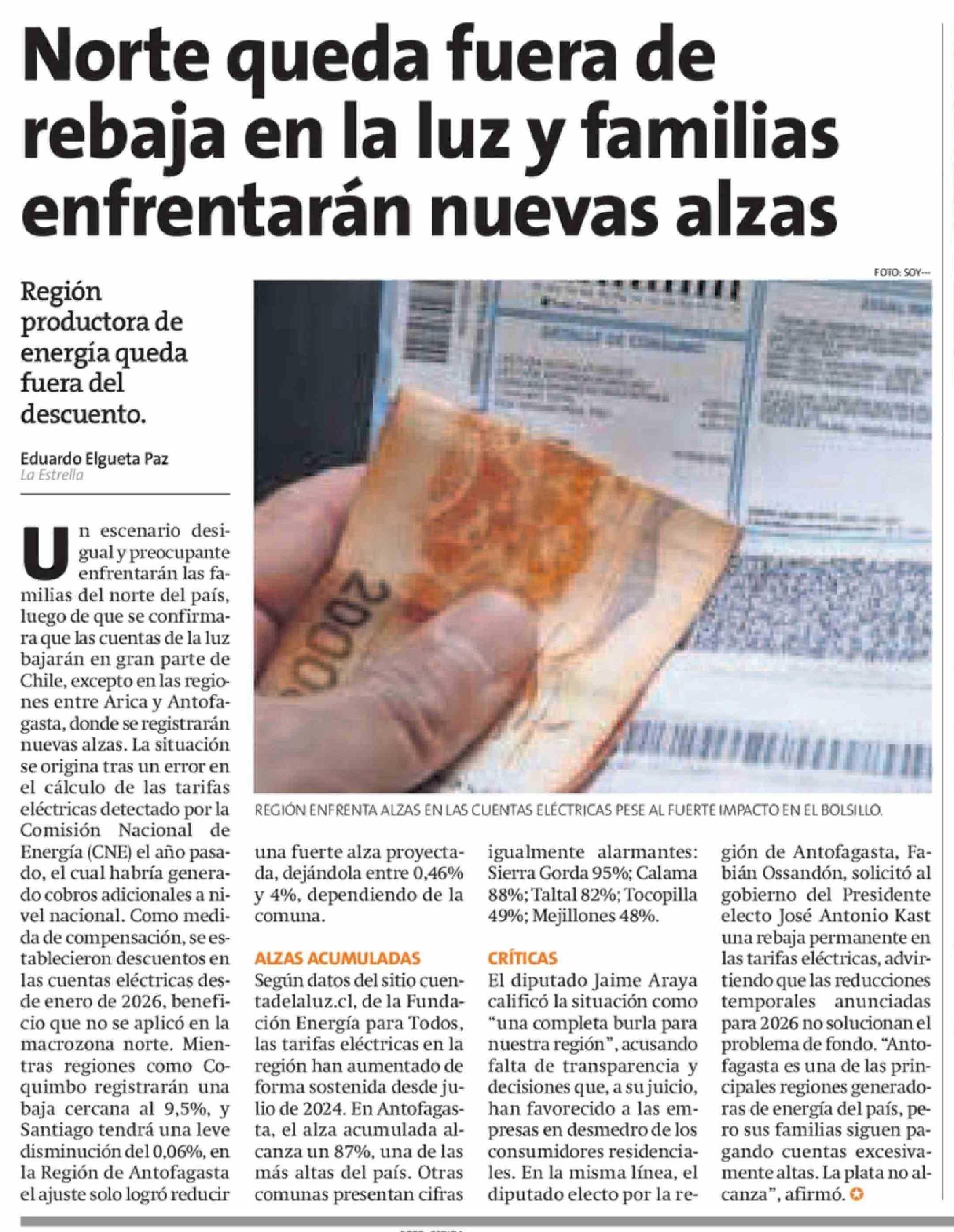 Norte queda fuera de rebaja en la luz y familias enfrentarán nuevas alzas 05-02-2026 La Estrella de Antofagasta |