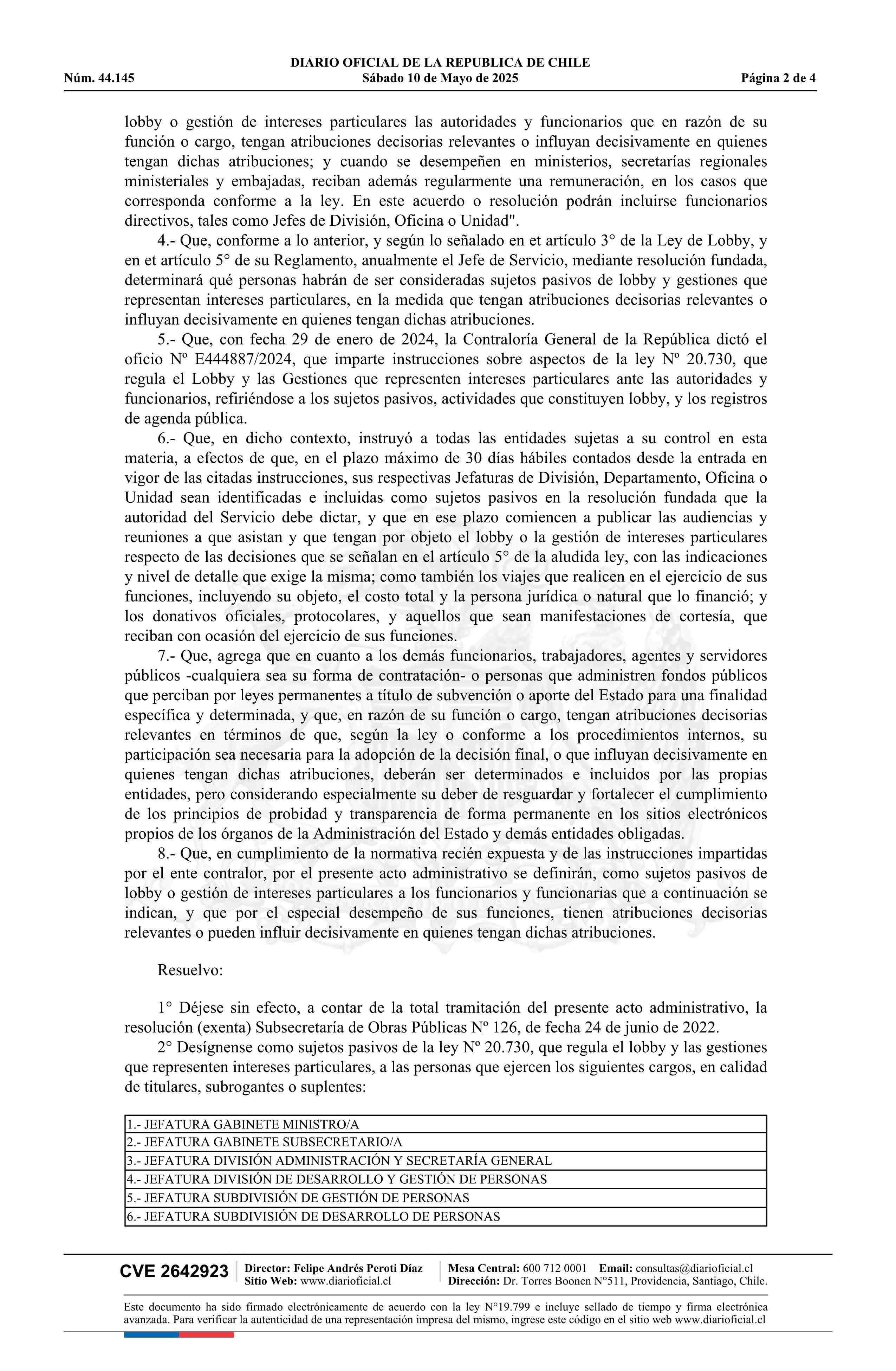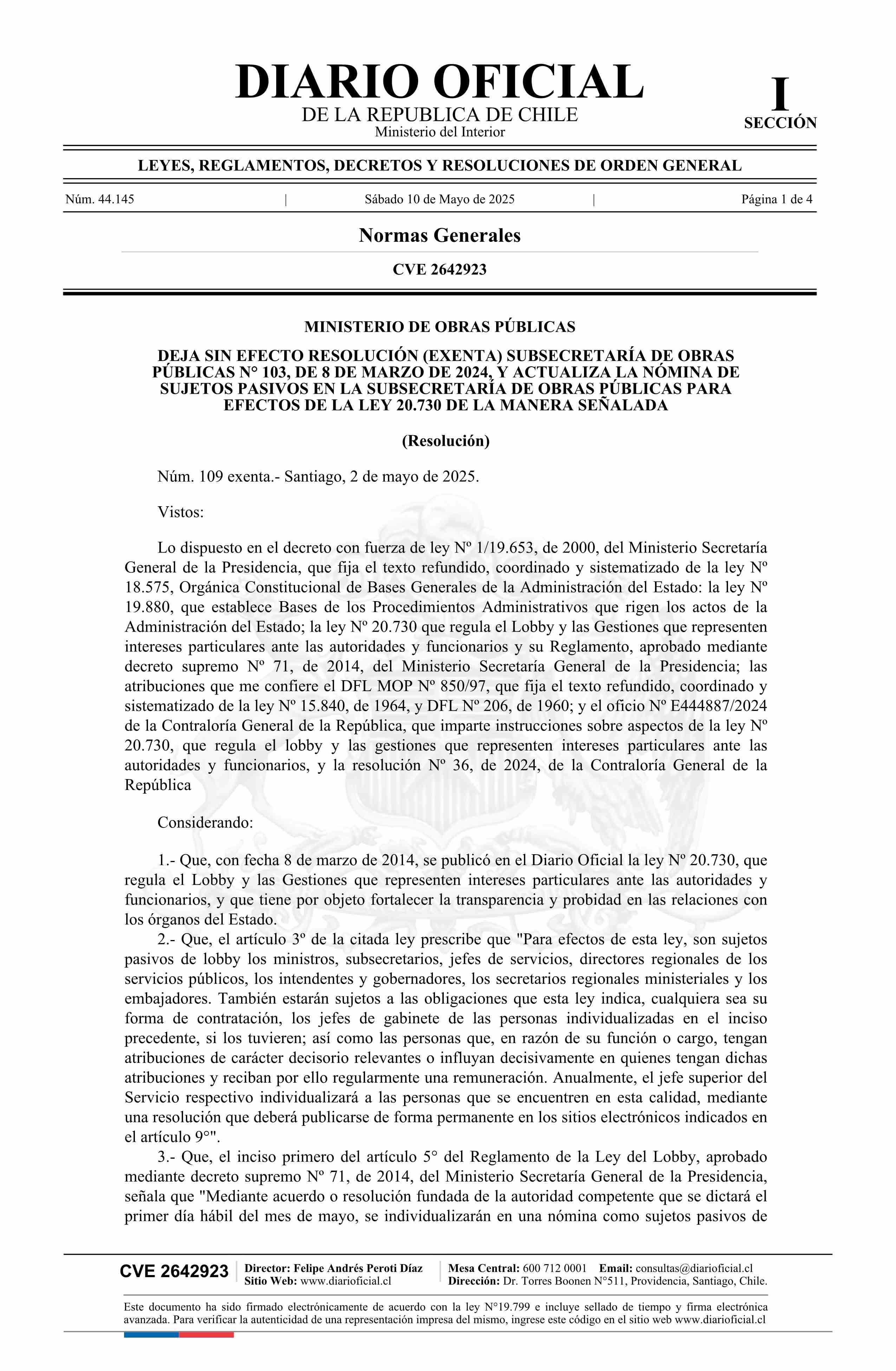 | Título: | Resolución exenta número 109, de 2025.- Deja sin efecto resolución N° 103 exenta, de 2024, y actualiza nómina de sujetos pasivos en la Subsecretaría de Obras Públicas para efectos de la ley 20.730 de la manera señalada |