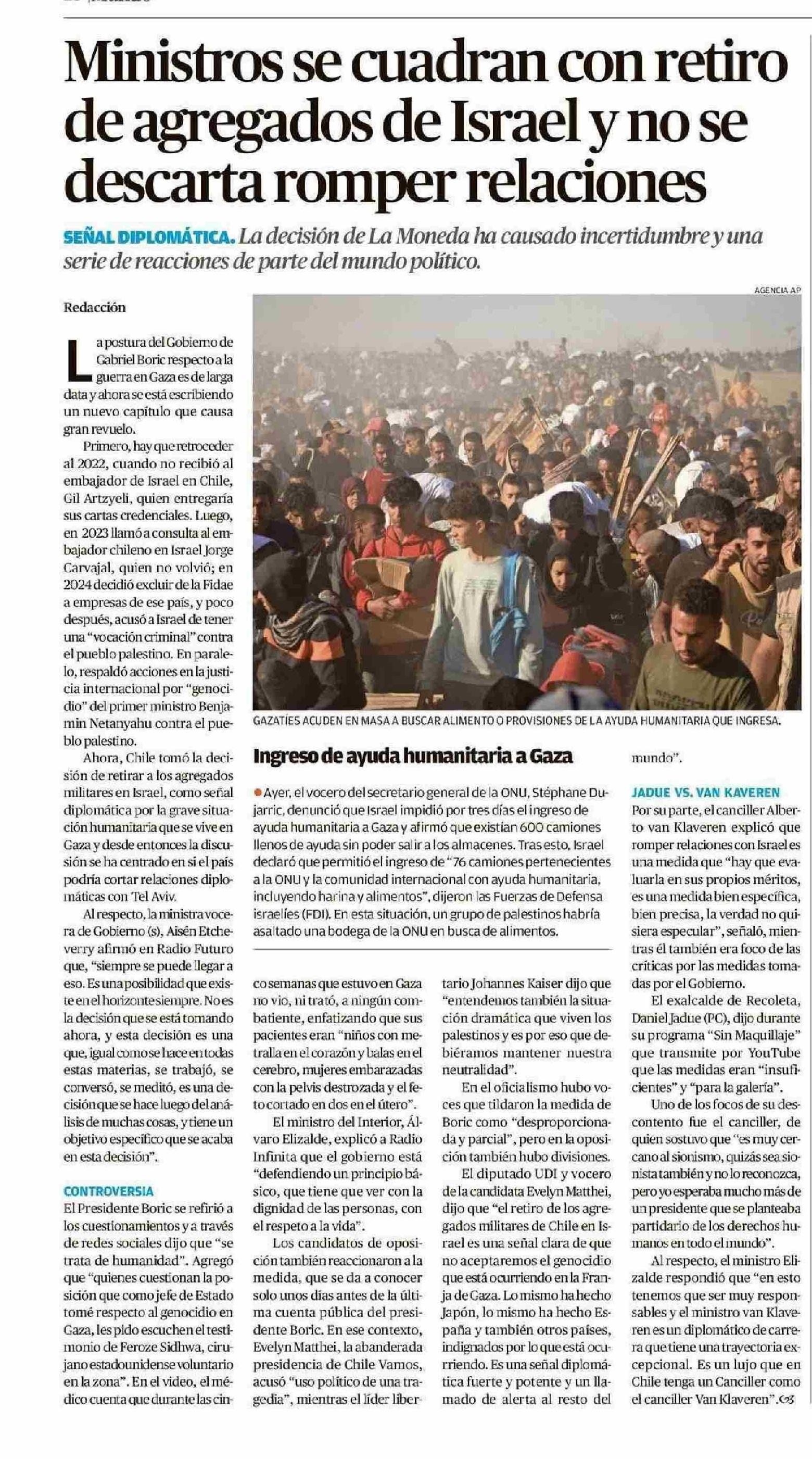 Ministros se cuadran con retiro de agregados de Israel y no se descarta romper relaciones 30-05-2025 Crónica de Chillán |