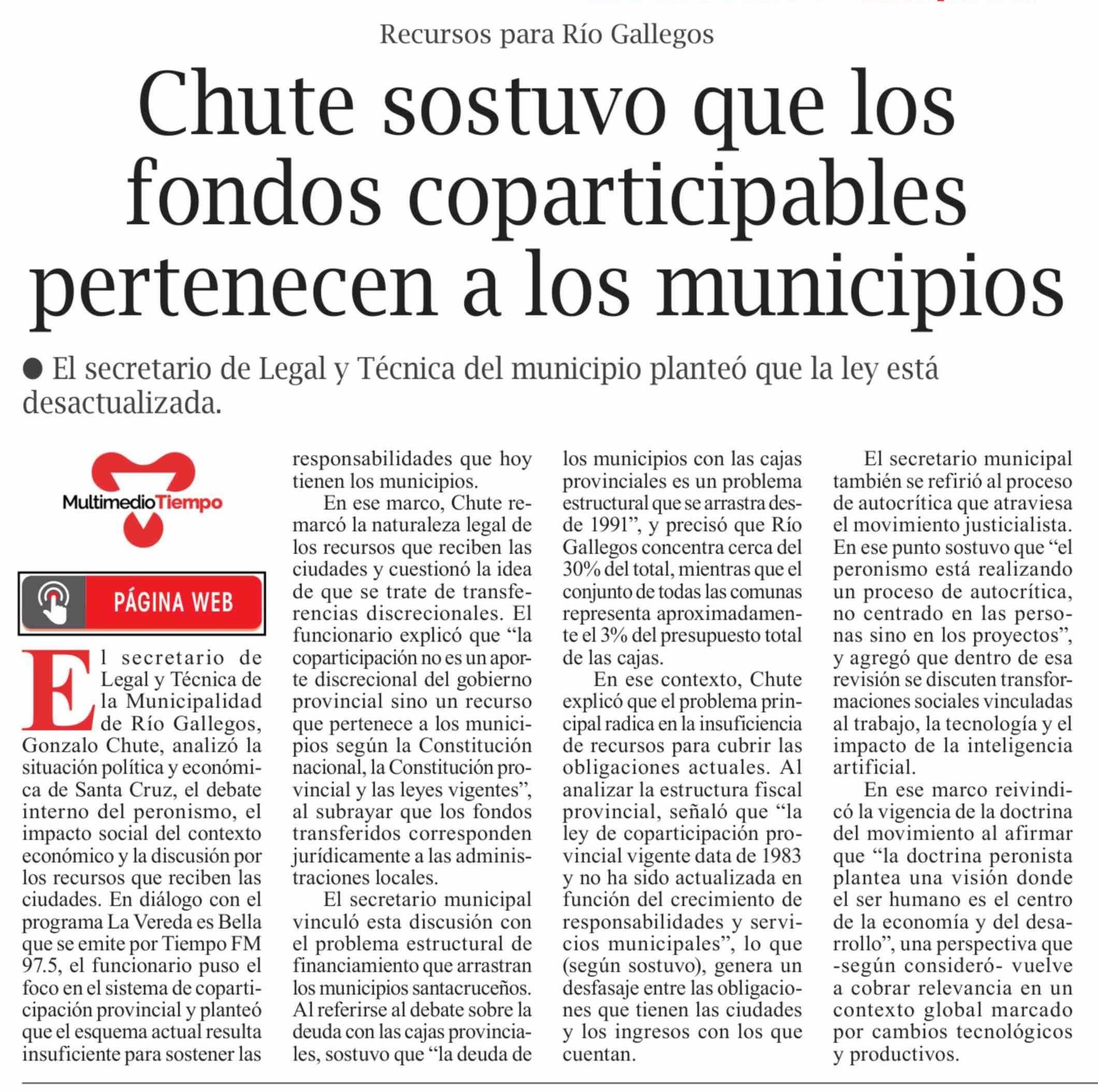Título: Chute sostuvo que los fondos coparticipables pertenecen a los municipios