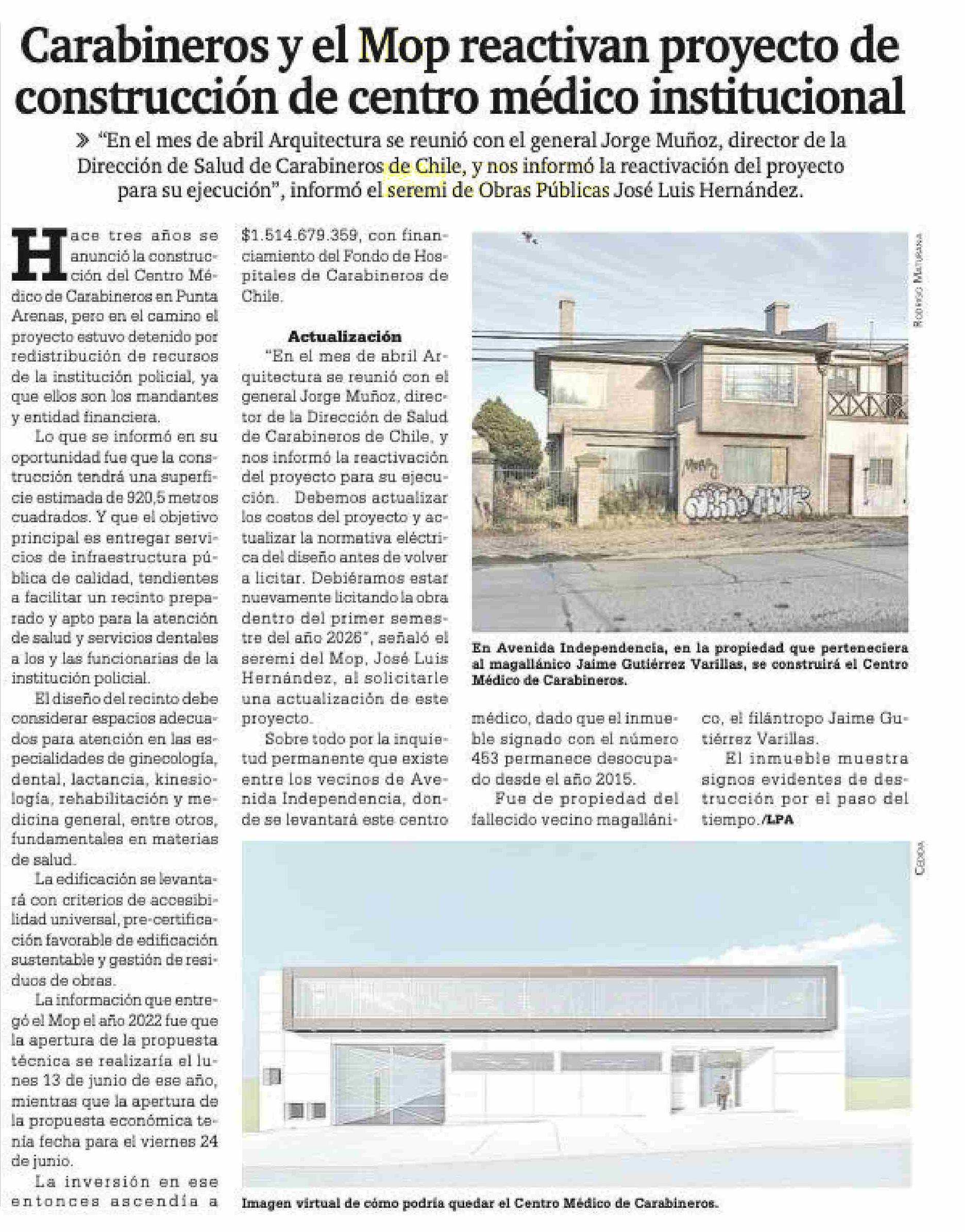 Carabineros y el Mop reactivan proyecto de construcción de centro médico institucional 02-06-2025 La Prensa Austral |