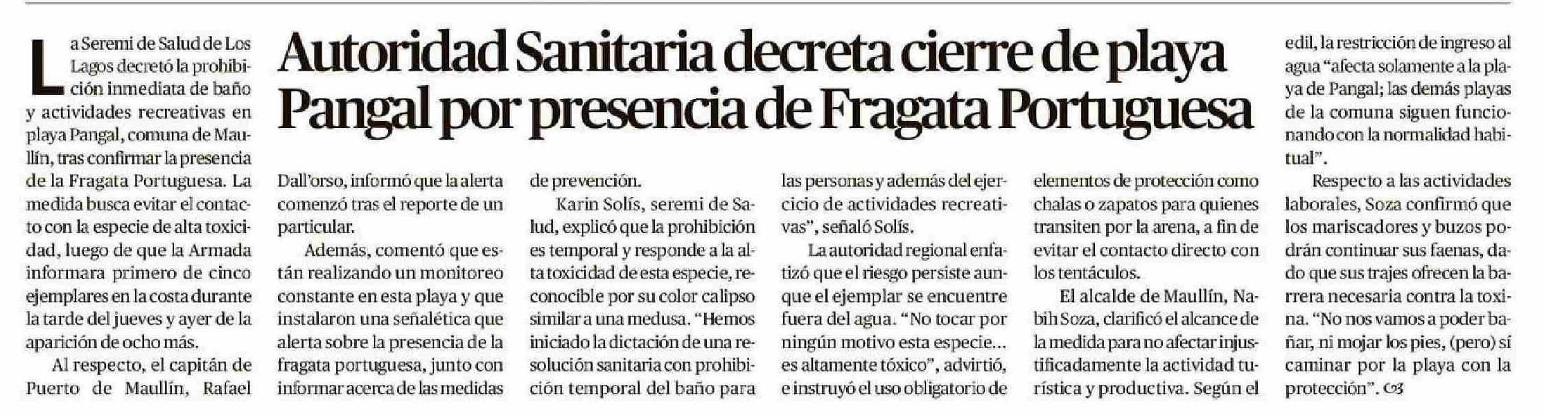 | Título: | Autoridad Sanitaria decreta cierre de playa Pangal por presencia de Fragata Portuguesa |