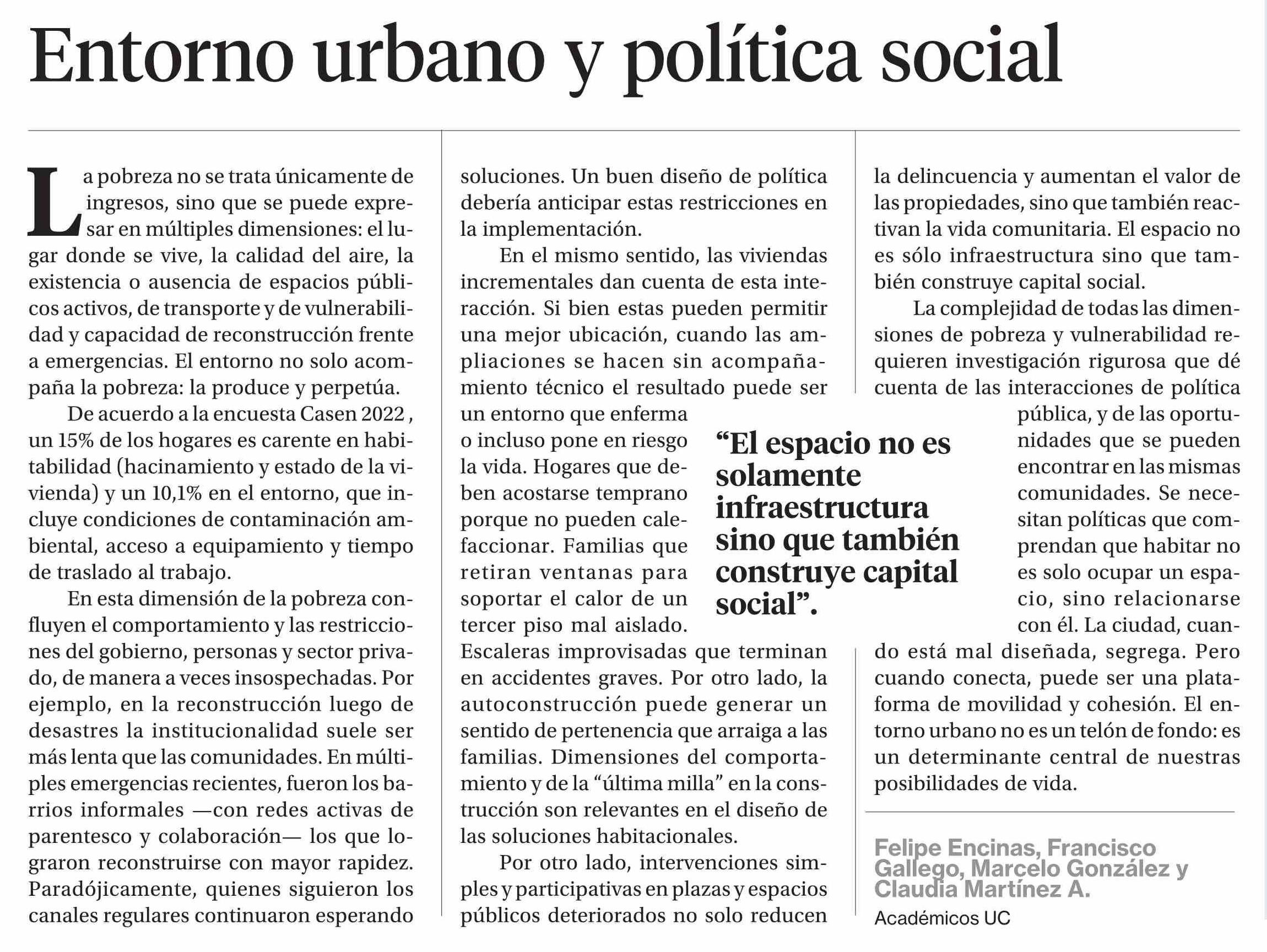 Columnas de Opinión: Entorno urbano y política social 08-01-2026 La Segunda |