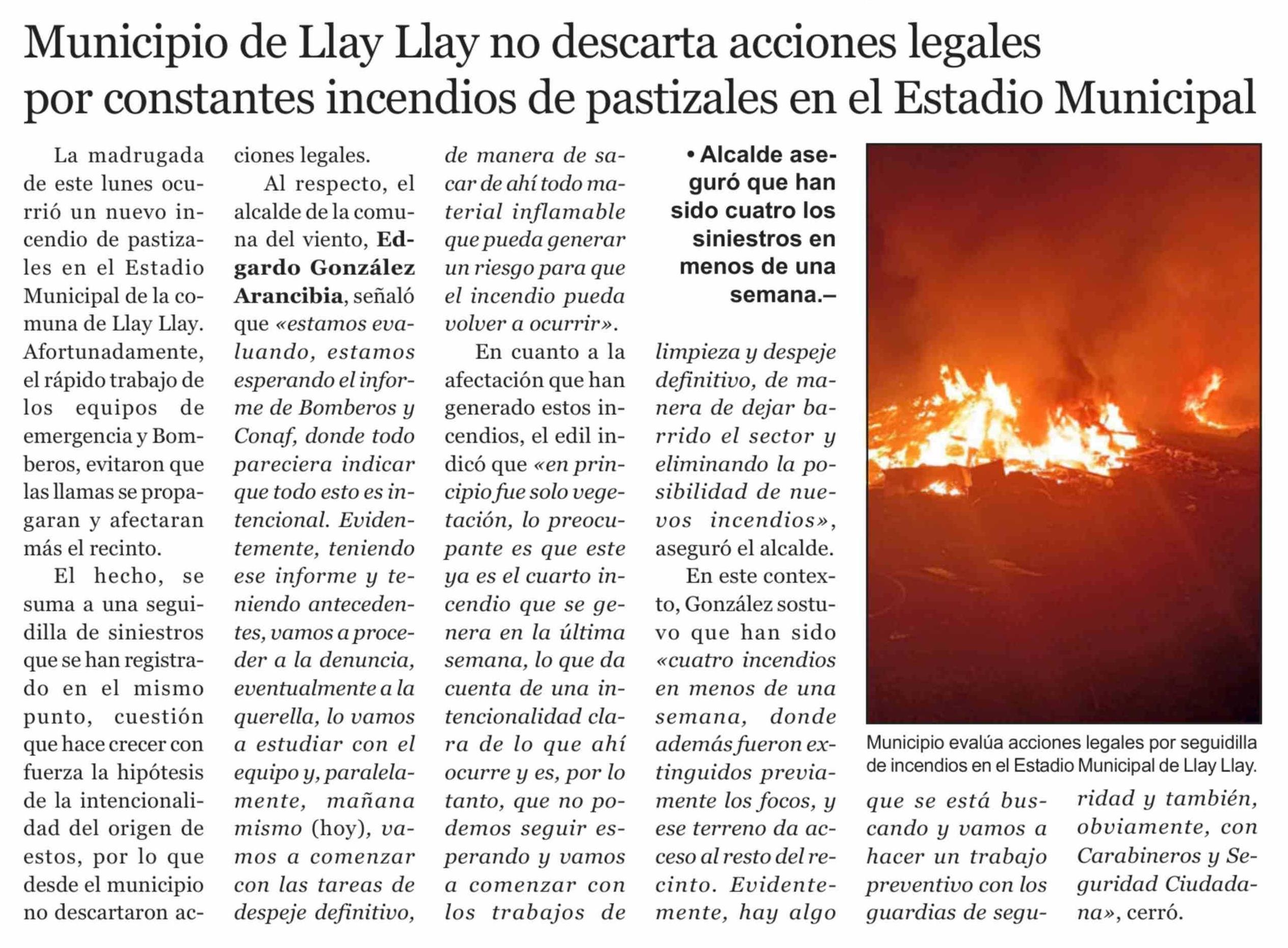 Municipio de Llay Llay no descarta acciones legales por constantes incendios de pastizales en el Estadio Municipal 14-04-2026 El Trabajo |