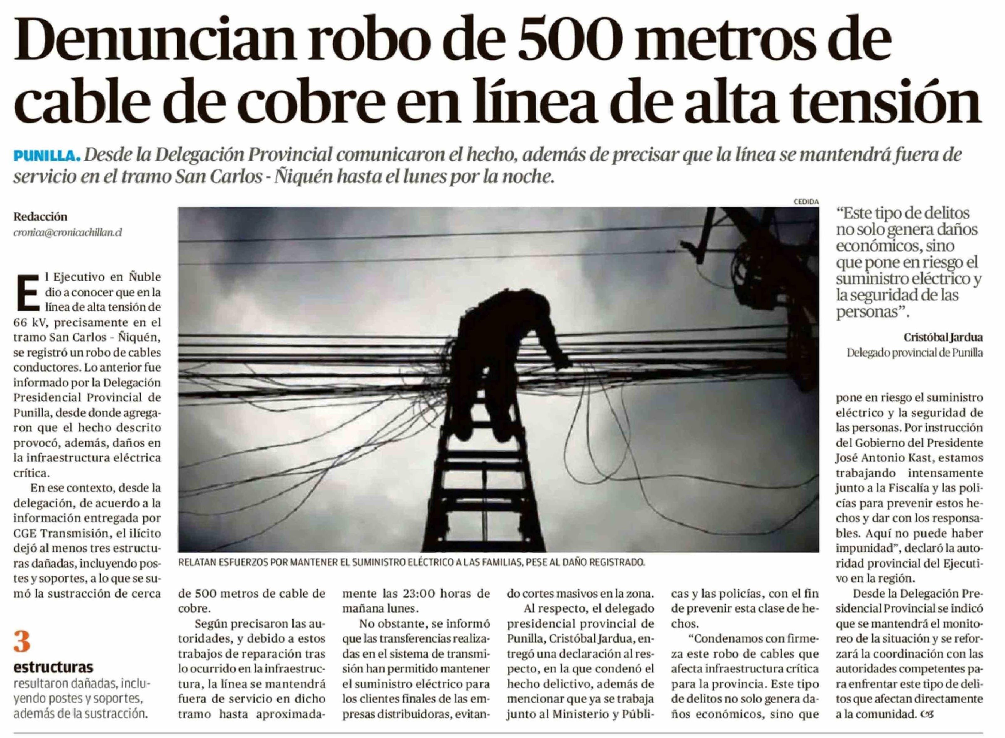 Denuncian robo de 500 metros de cable de cobre en línea de alta tensión 29-03-2026 Crónica de Chillán |