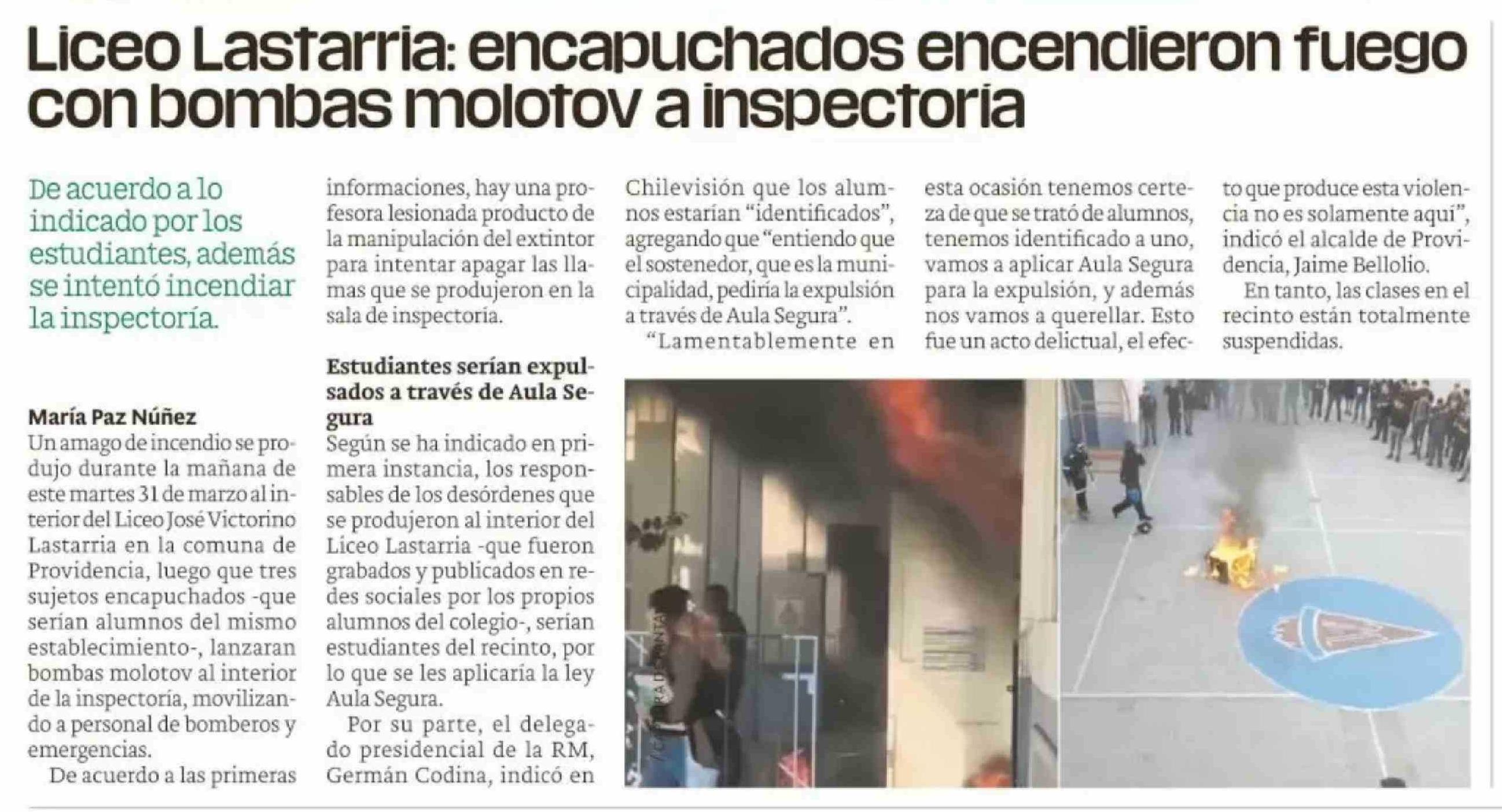 | Título: | Liceo Lastarria: encapuchados encendieron fuego con bombas molotov a inspectoria |