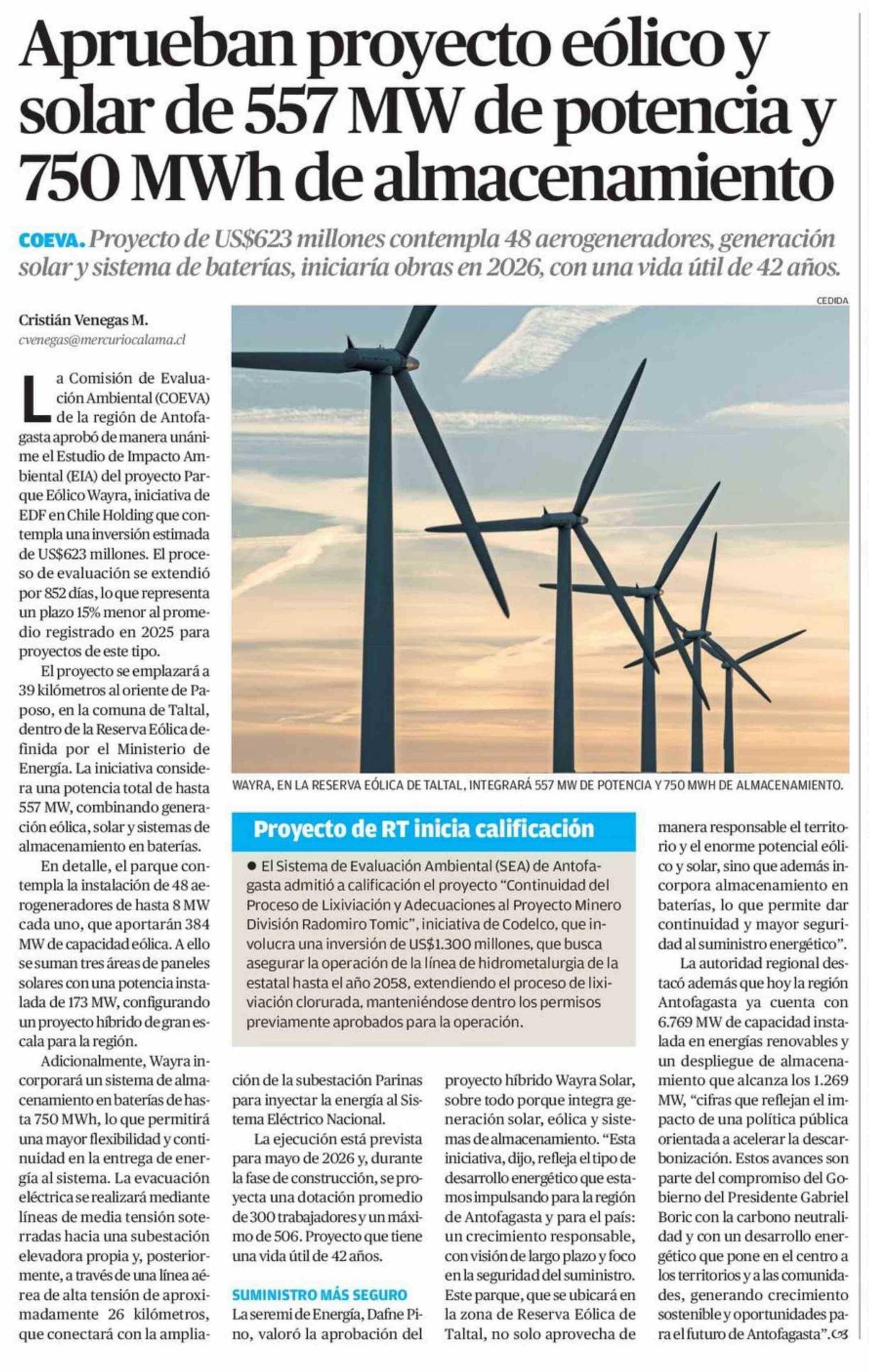 Aprueban proyecto eólico y solar de 557 MW de potencia y 750 MWh de almacenamiento 22-01-2026 El Mercurio de Antofagasta |