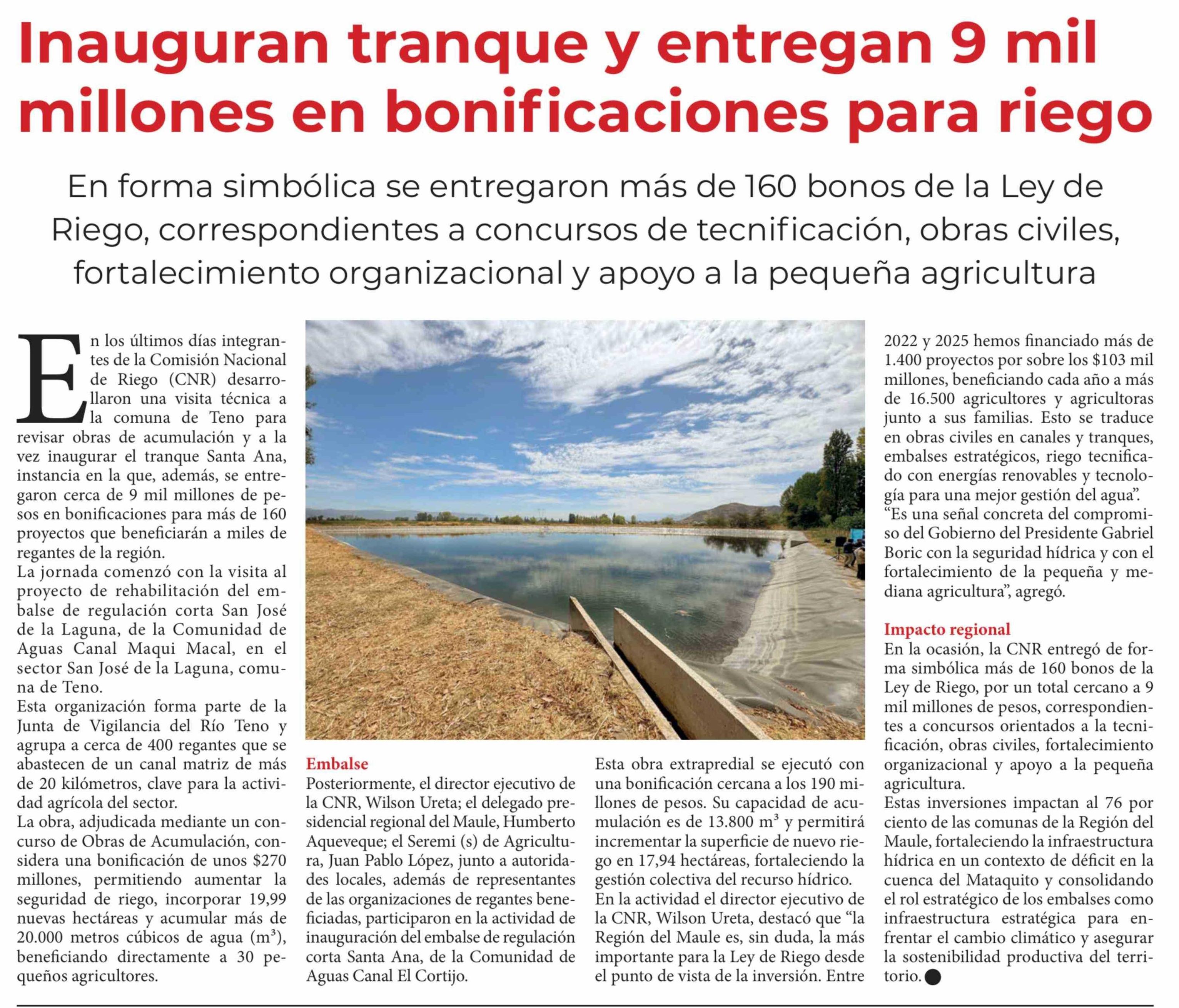 Inauguran tranque y entregan 9 mil millones en bonificaciones para riego 08-03-2026 Diario Talca |