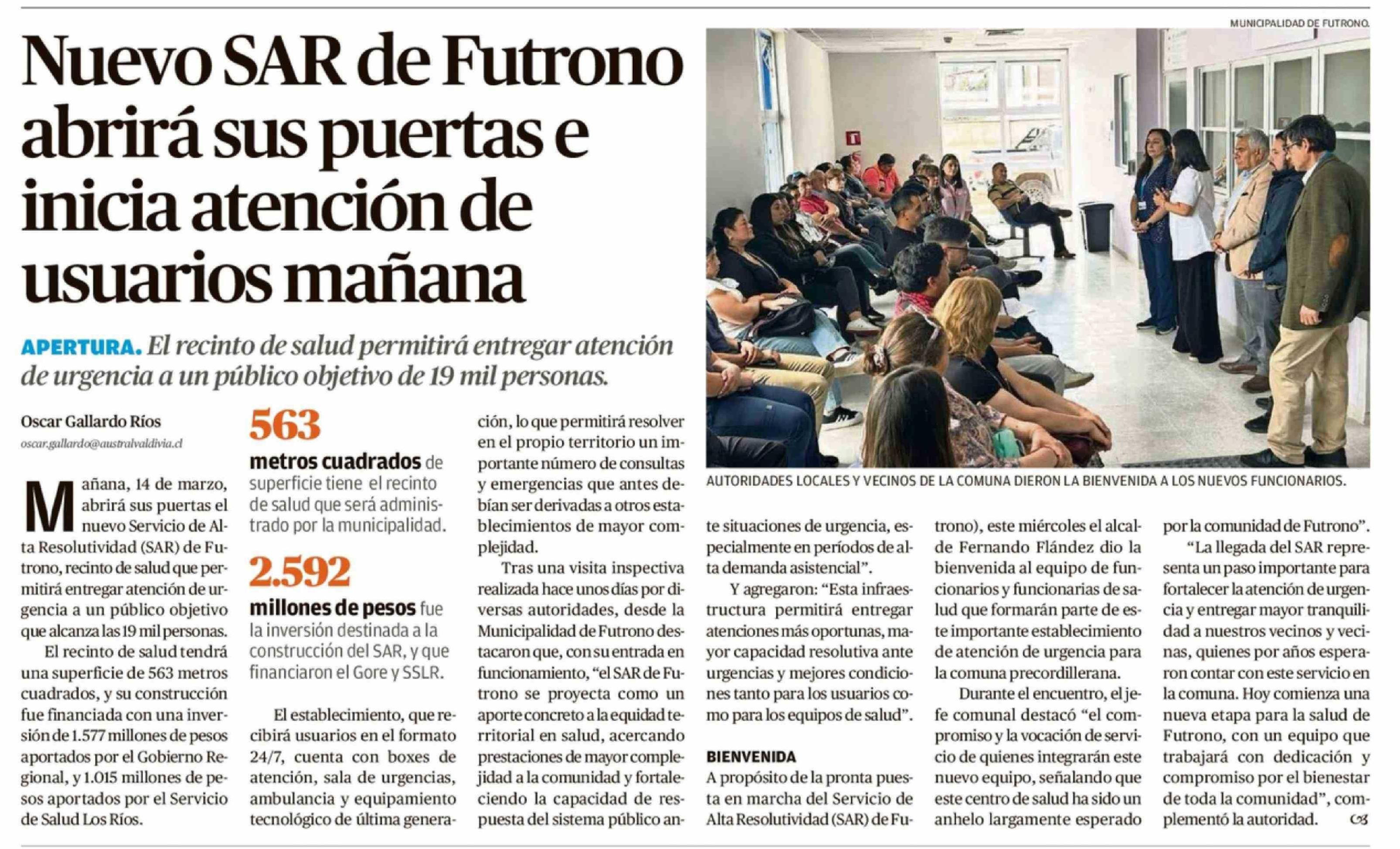 Título: Nuevo SAR de Futrono abrirá sus puertas e inicia atención de usuarios mañana