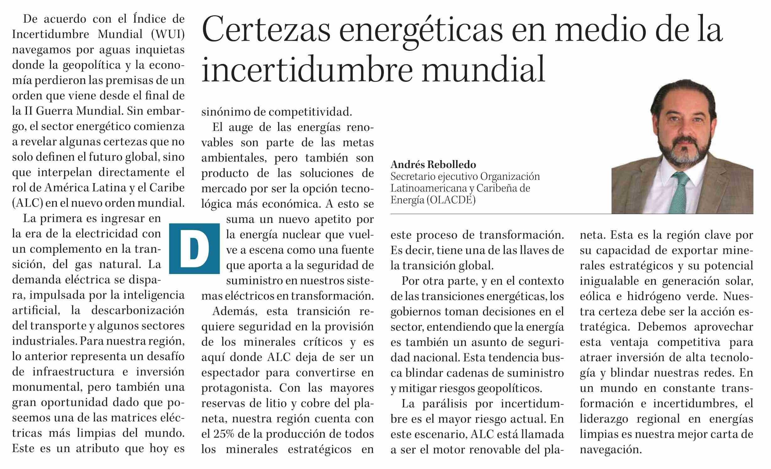 | Título: | Columnas de Opinión: Certezas energéticas en medio de la incertidumbre mundial |