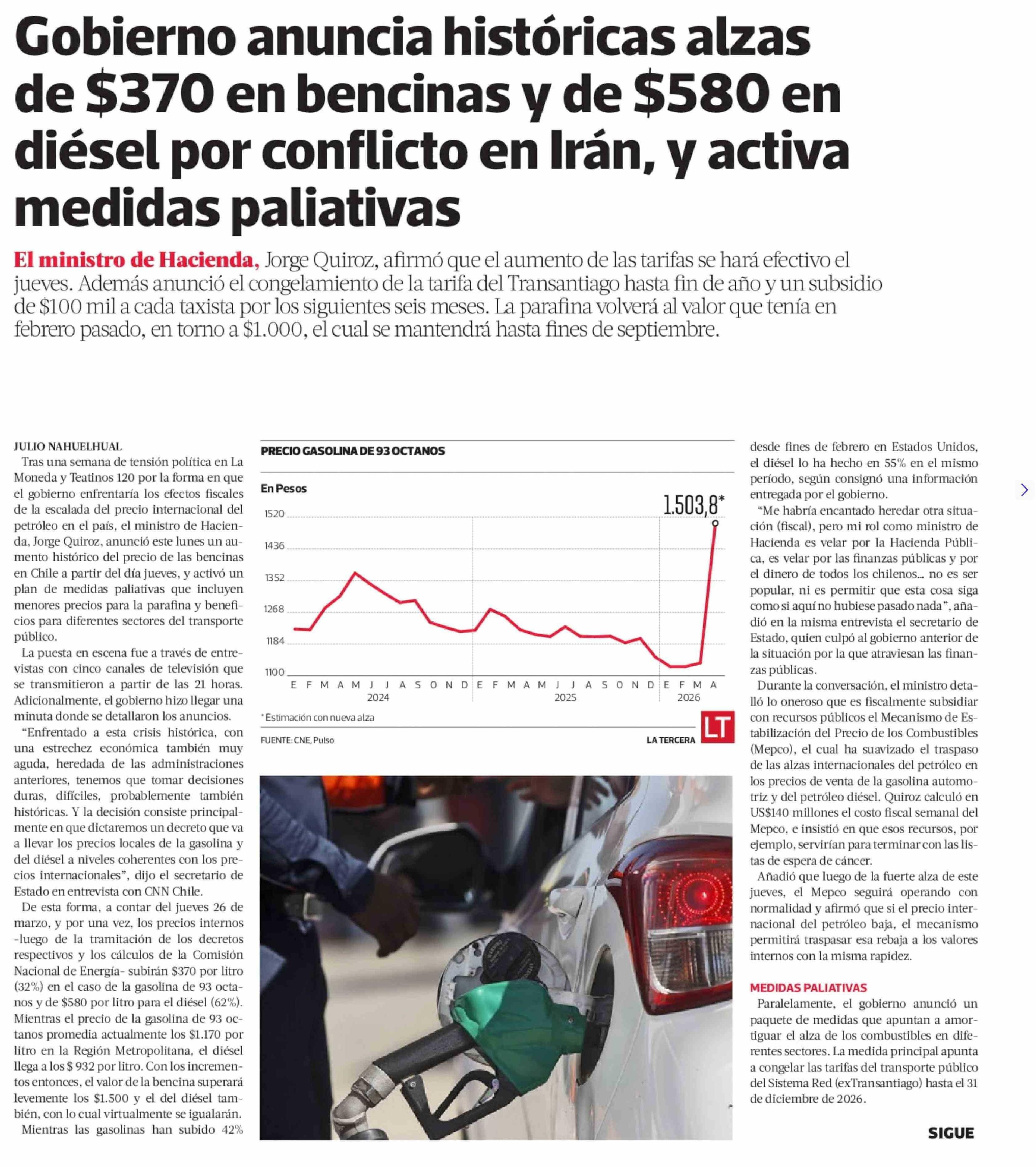 Título: Gobierno anuncia históricas alzas de $370 en bencinas y de $580 en diésel por conflicto en Iran, y activa medidas paliativas