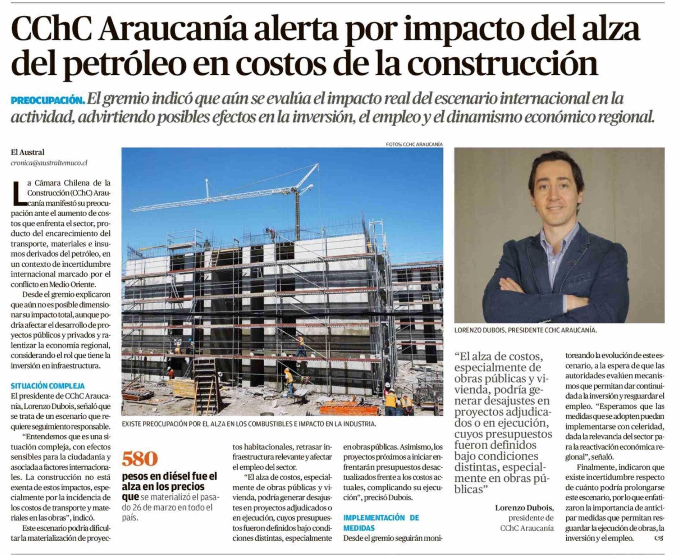 CChC Araucanía alerta por impacto del alza del petróleo en costos de la construcción 06-04-2026 El Austral de la Araucanía |