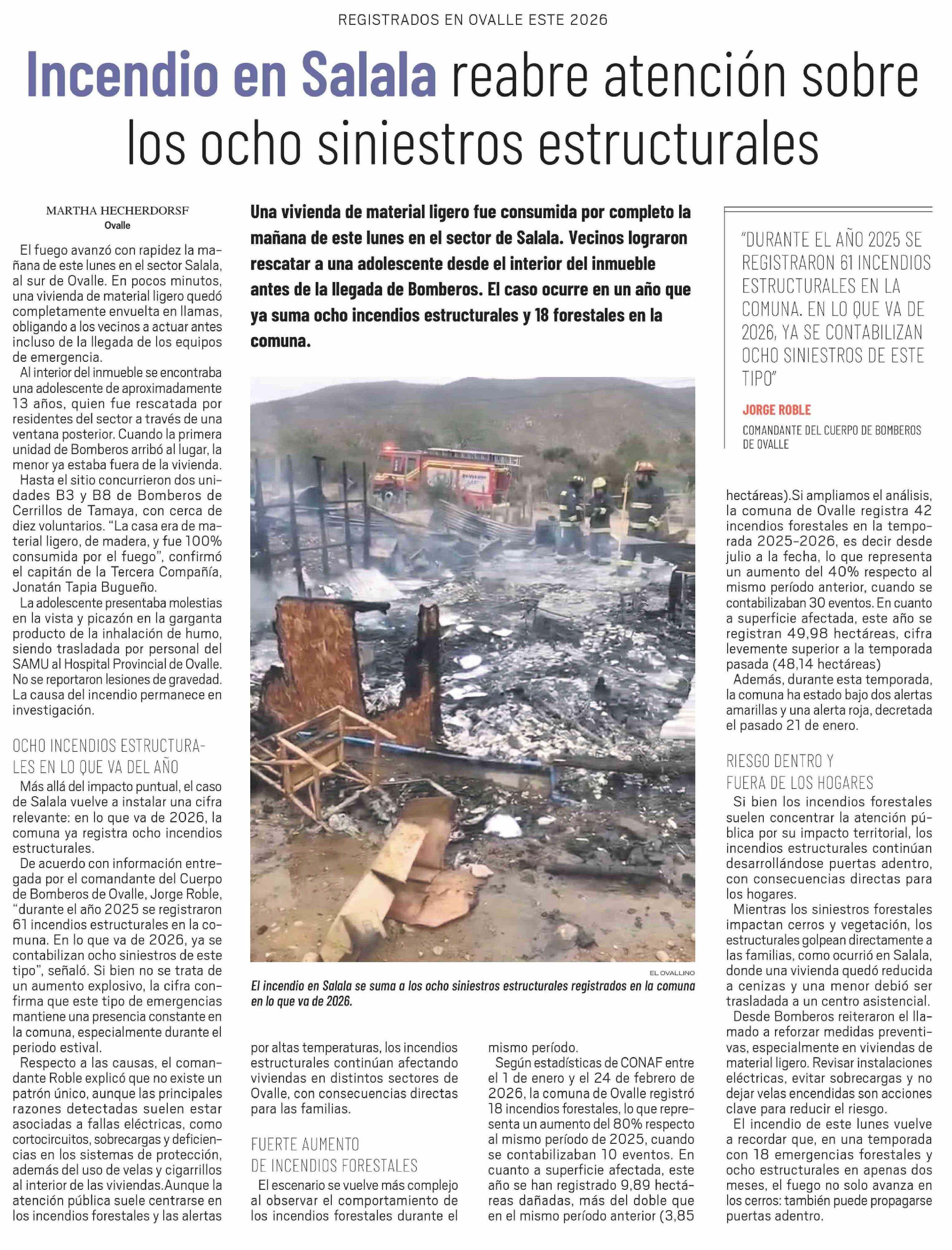 Incendio en Salala reabre atención sobre los ocho siniestros estructurales 25-02-2026 El Ovallino |