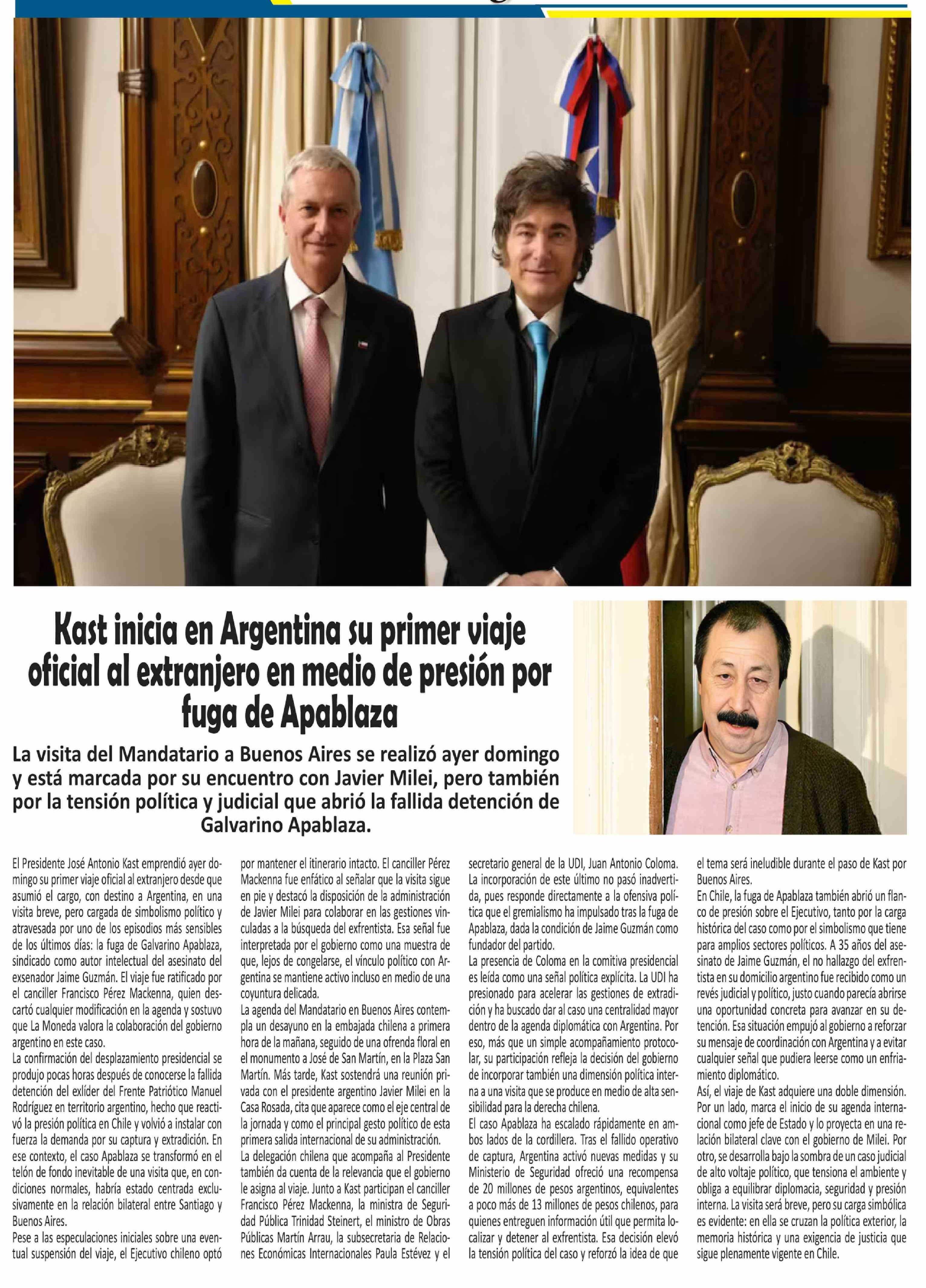 Título: Kast inicia en Argentina su primer viaje oficial al extranjero en medio de presión por fuga de Apablaza