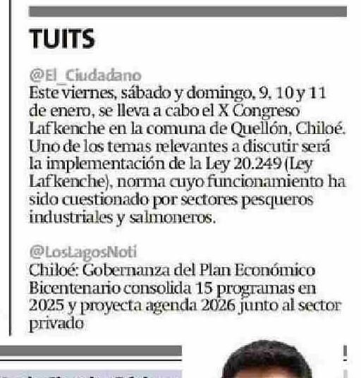 TUITS @El_Ciudadano Este viernes, sábado y domingo, 9, 10 y 11 de enero, se lleva a cabo el X Congreso Lafkenche en la comuna de Quellón, Chiloé. Uno de los temas relevantes a discutir será la implementación de la Ley 20.249 (Ley Lafkenche), norma cuyo funcionamiento ha sido cuestionado por sectores