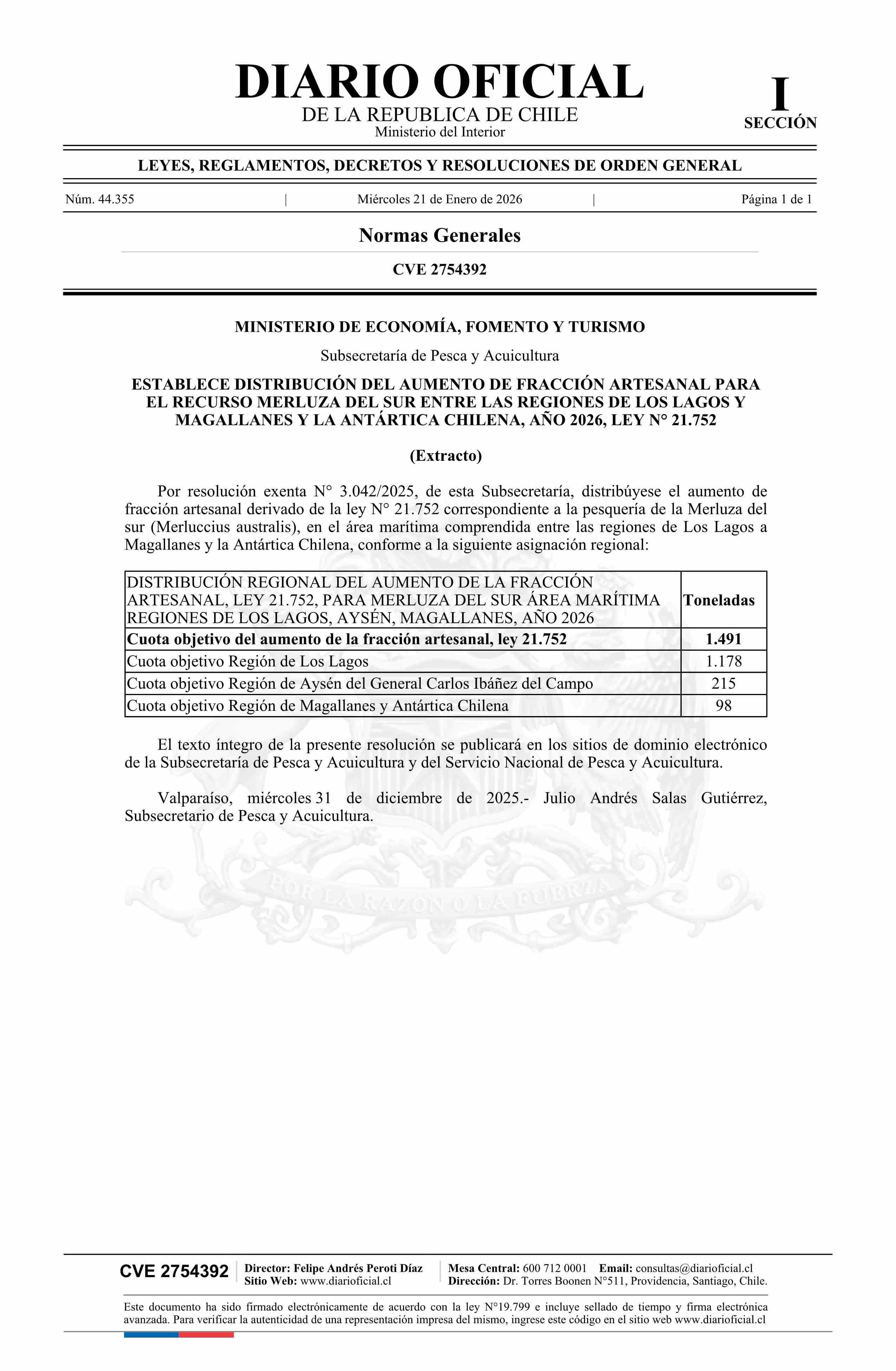 Título: Extracto de resolución exenta número 3.042, de 2025.- Establece distribución del aumento de fracción artesanal para el recurso Merluza del sur entre las regiones de Los Lagos y Magallanes y la Antártica Chilena, año 2026, ley N° 21.752