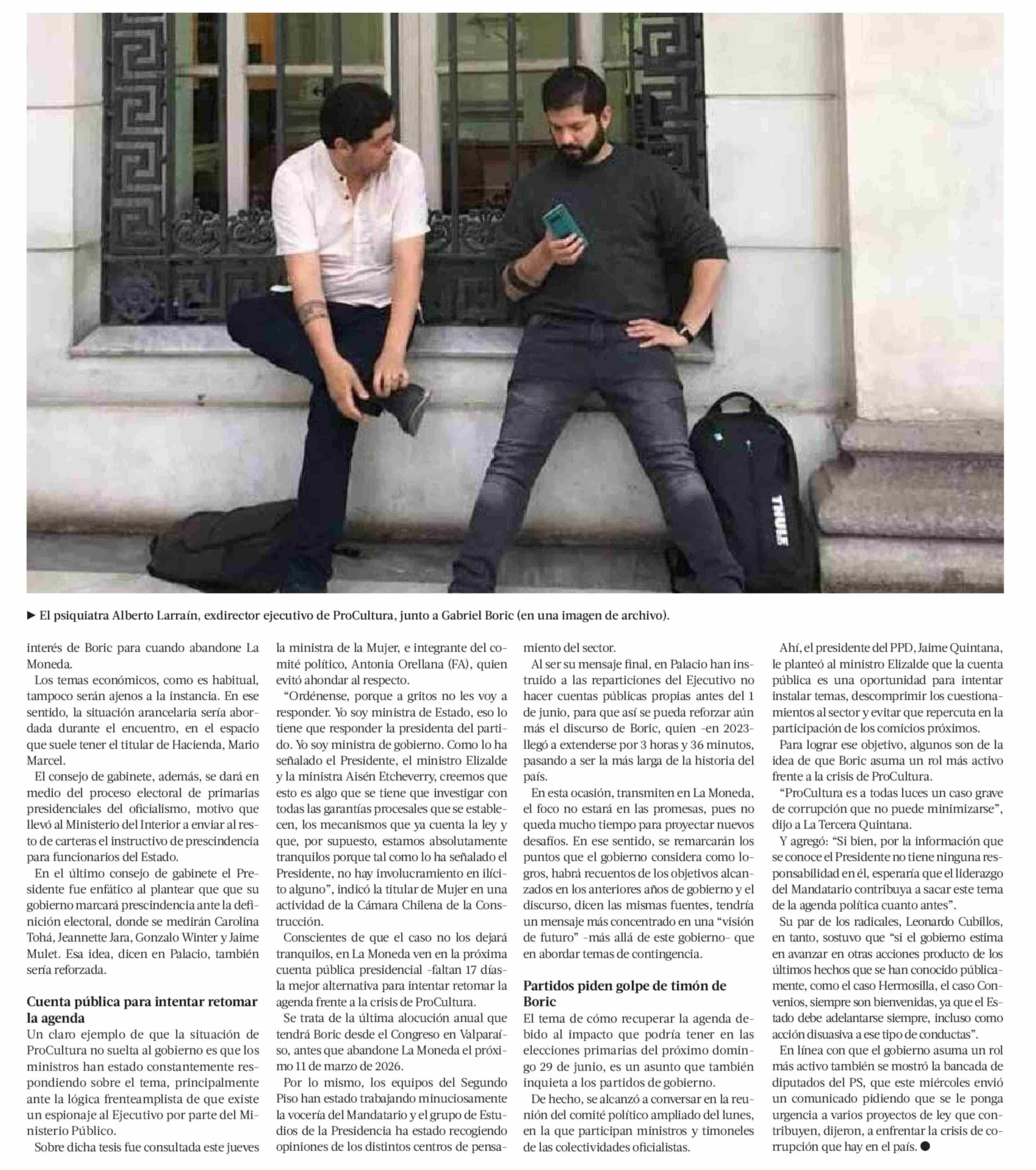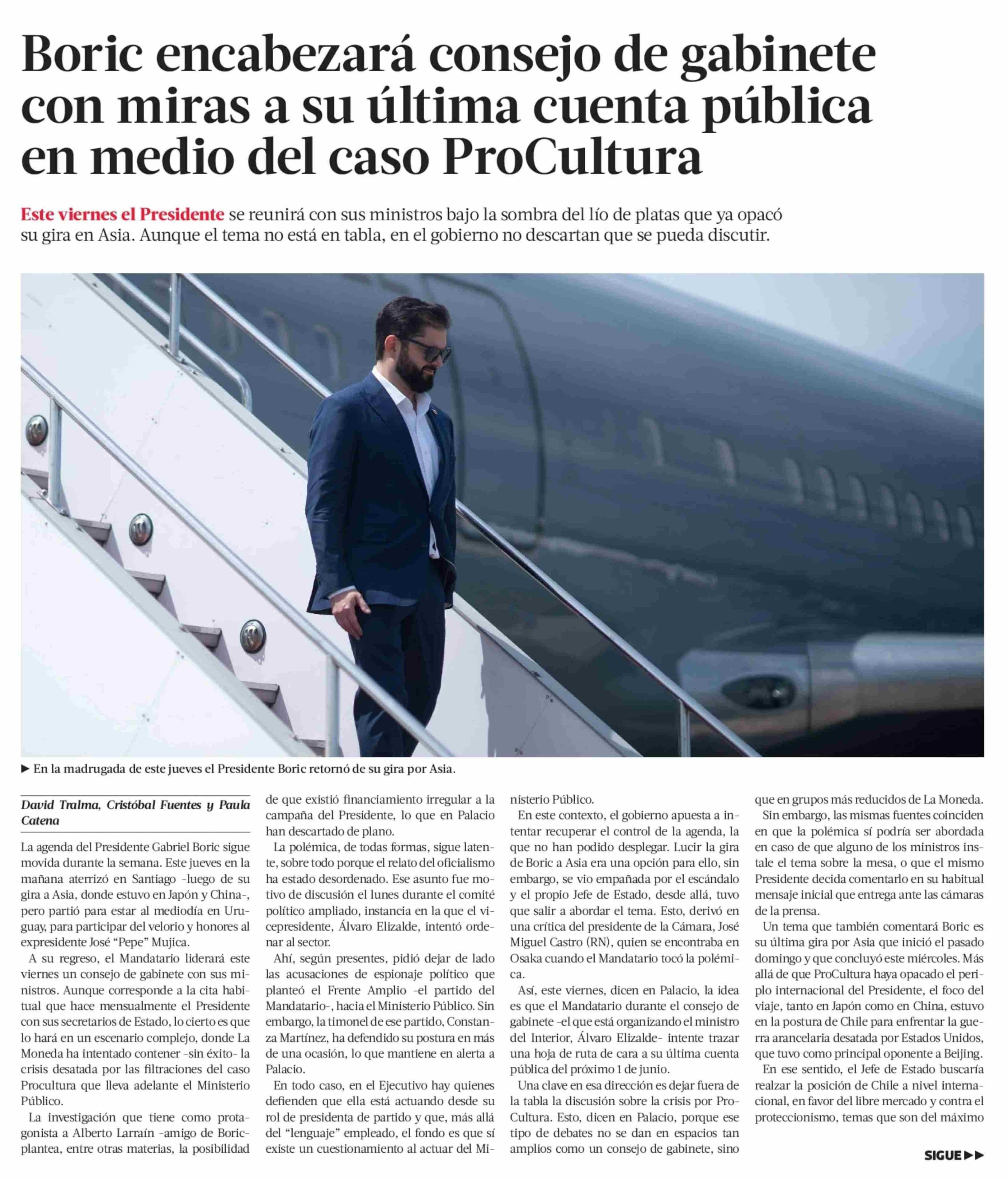 Boric encabezará consejo de gabinete con miras a su última cuenta pública en medio del caso ProCultura 16-05-2025 La Tercera |