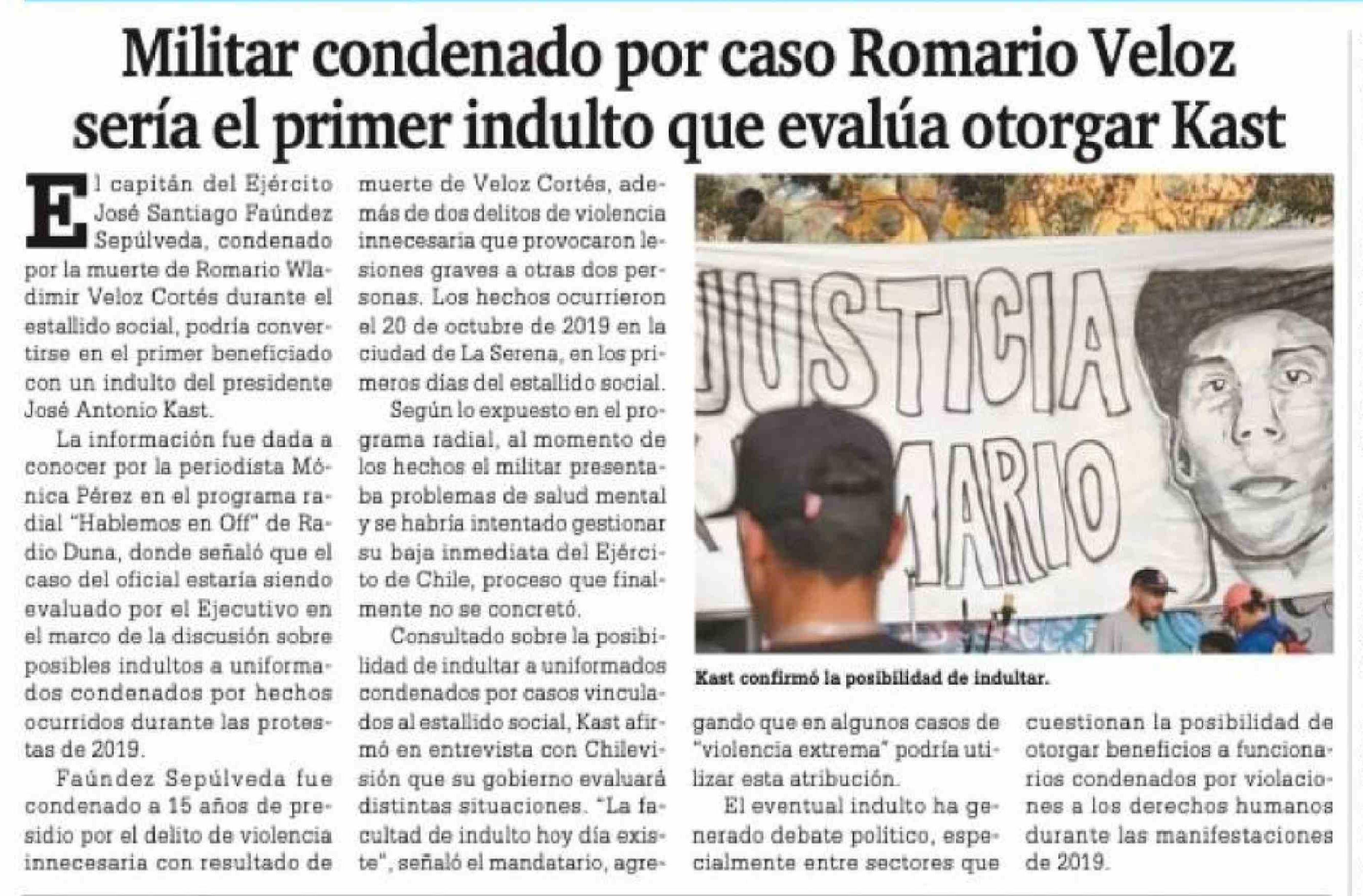 Título: Militar condenado por caso Romario Veloz sería el primer indulto que evalúa otorgar Kast