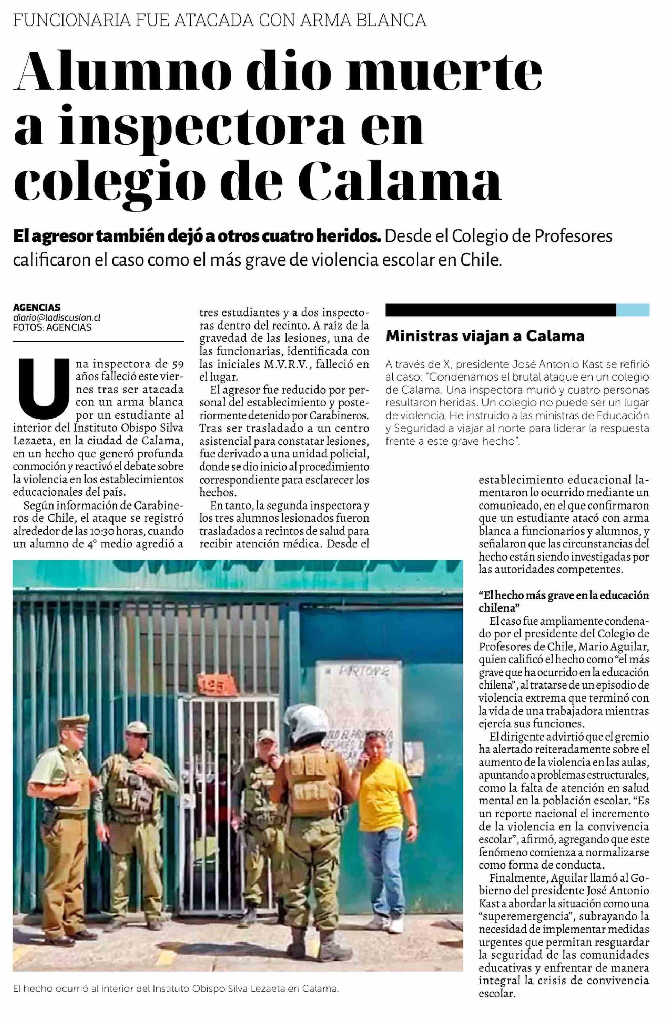 Alumno dio muerte a inspectora en colegio de Calama 28-03-2026 La Discusión |